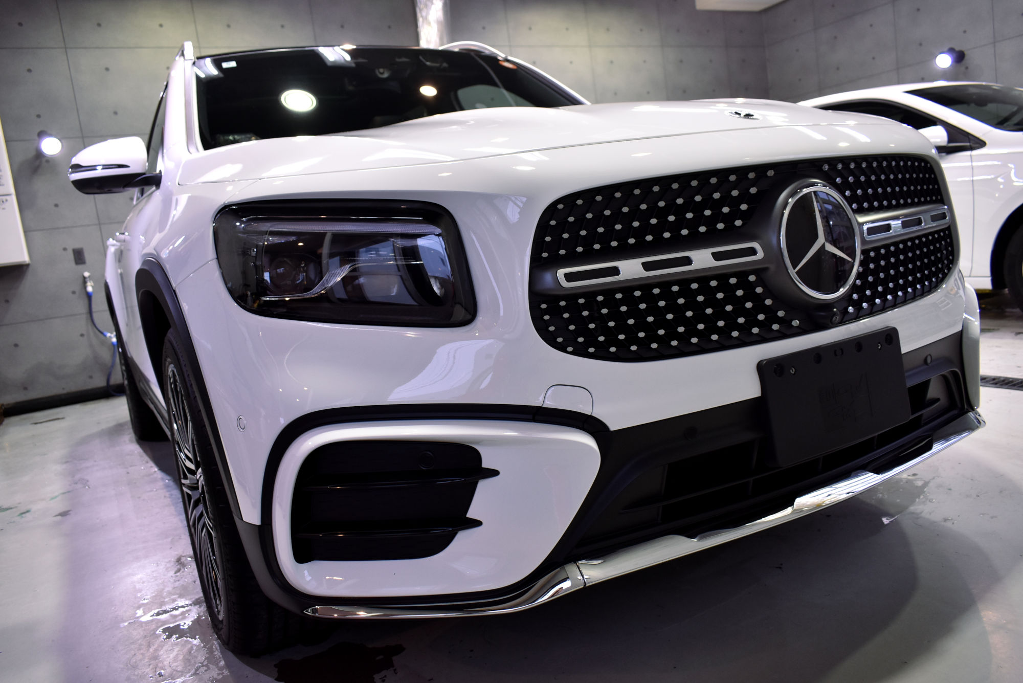 こちらGLBは力強いスクエアシルエットと都会的な洗練さを併せ持つデザインで、SUVらしいタフさを残しながらも、メルセデスらしい上質な存在感を放っております。そしてこちらのモデルには「AMGラインパッケージ」が装着されており、左右に大きな開口部が設けられたアグレッシブな意匠のバンパーと、クローム仕上げのダイヤモンドパターンが目を引くシングルルーバーのグリルが採用されスポーティーさが強調されております。