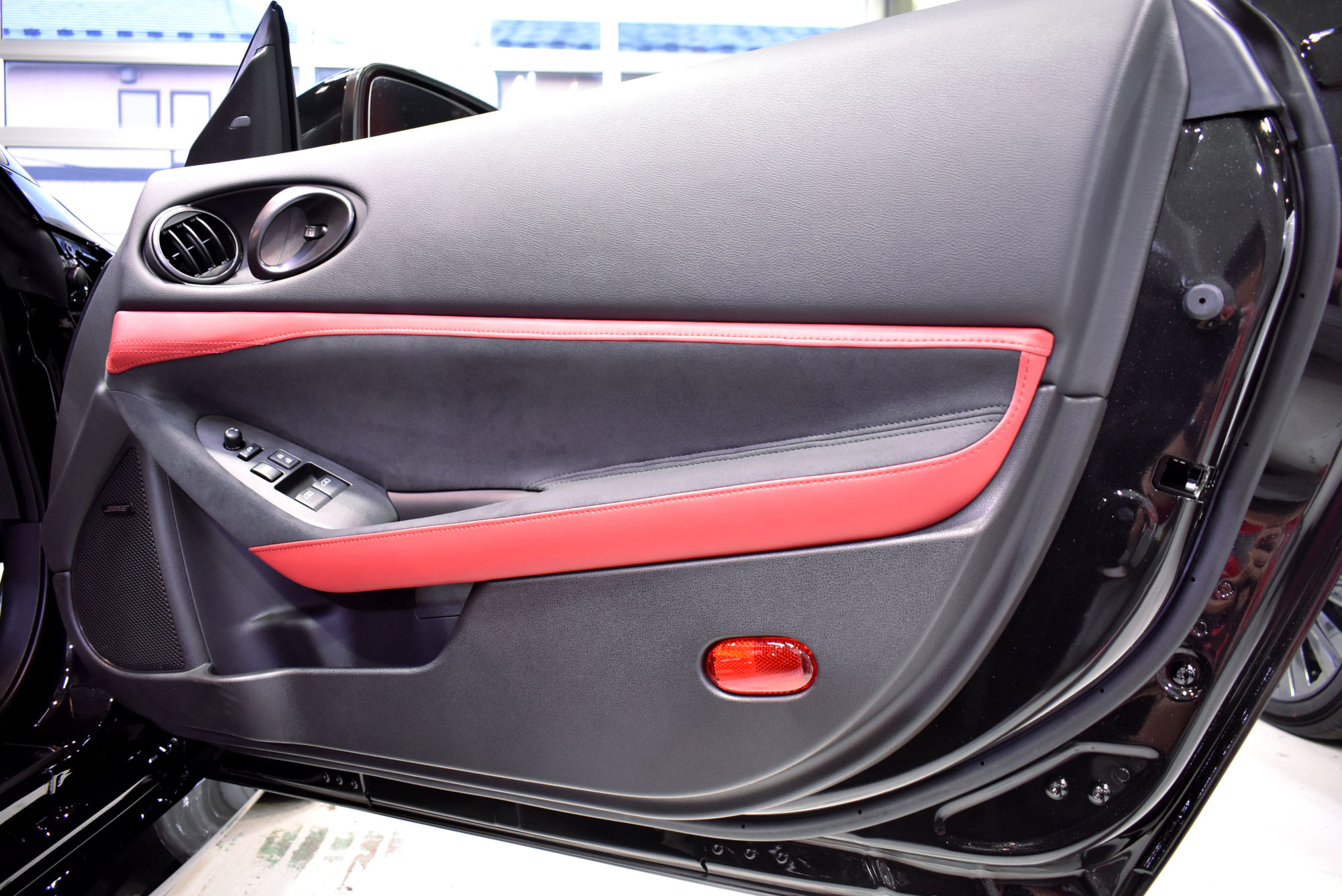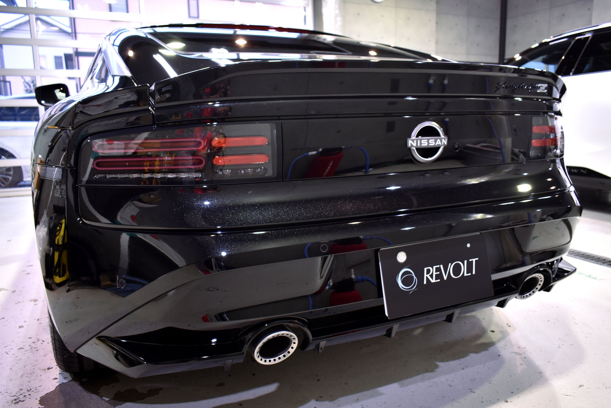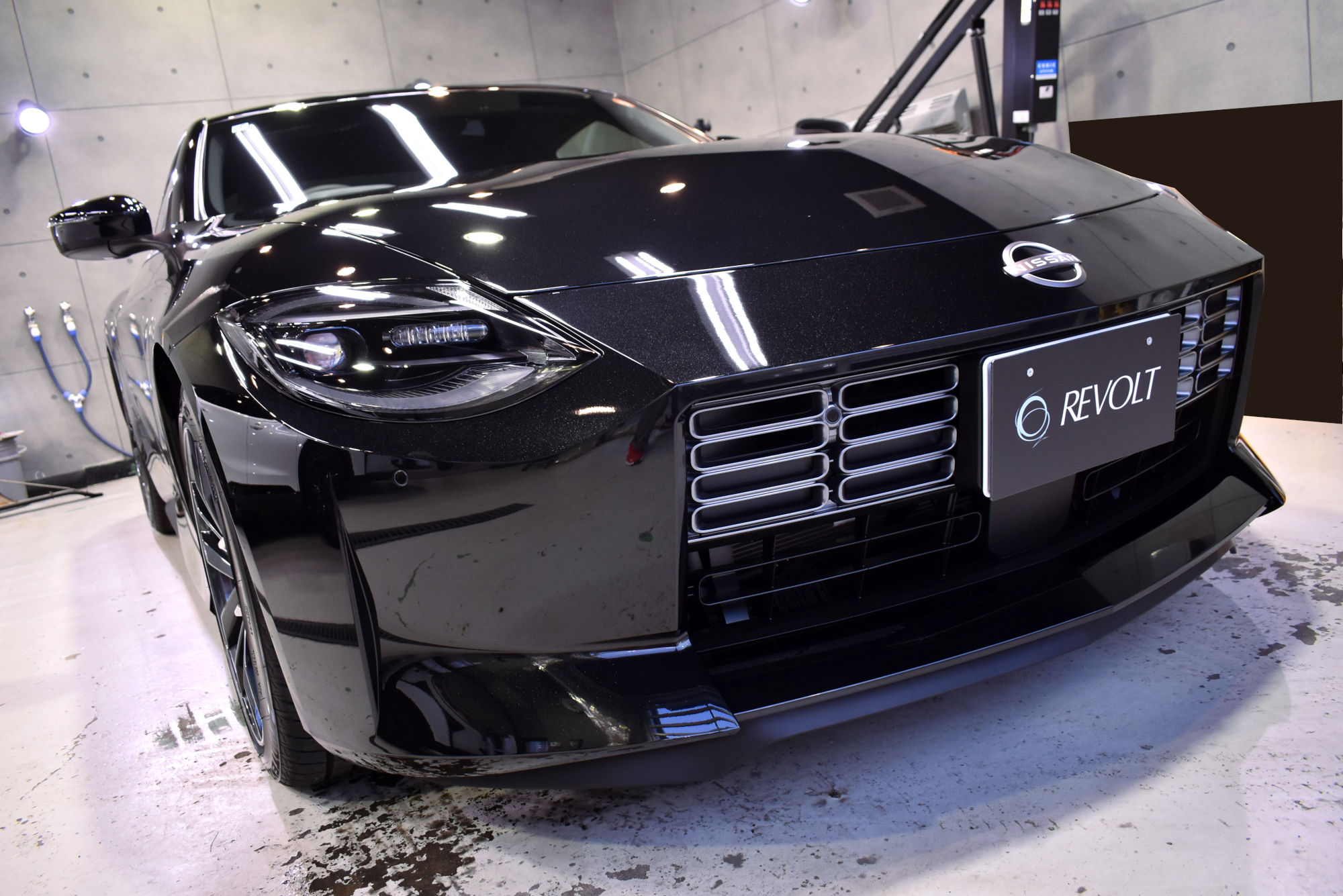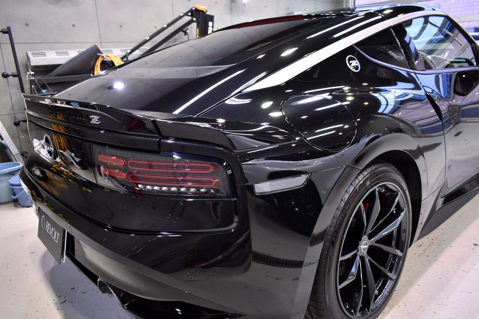 施工につきましては、オーナー様の拘りで、セラミックベースコート2層追加で3層、トップコート・オーバートップコートを重ねて5層仕上げ、ドアヒンジ周りにもベースコート、トップコート・オーバートップコートの3層コーティングをオーダーいただきました。下地処理につきましては、ニッサンの自己修復機能を持ったスクラッチシールド塗装に適合するように「Revolt Adjust System(リボルト アジャスト システム)」という独自の下地処理・施工方法技術を駆使してさらに時間を掛けて優しく磨き上げます。その後は、こうしてこうして綺麗に整った塗装面をしっかり保護するべくコーティング塗布作業に移行しますが、スペシャルオーダーにより、粘度が高いベースコートを塗布して拭き上げる作業を根気強くボディ全体を3往復します。そしてトップコートおよびオーバートップコートを更に重ねて最強の5層仕上げが完成です。
