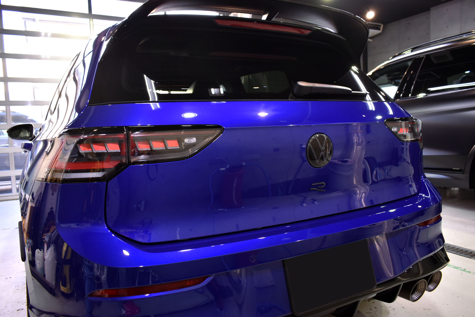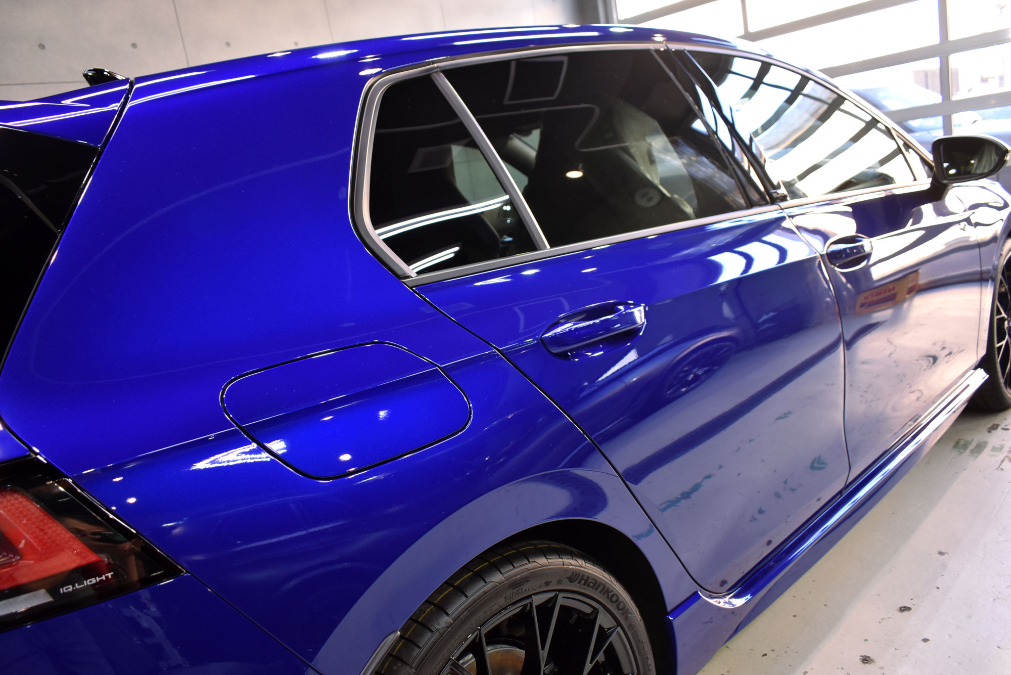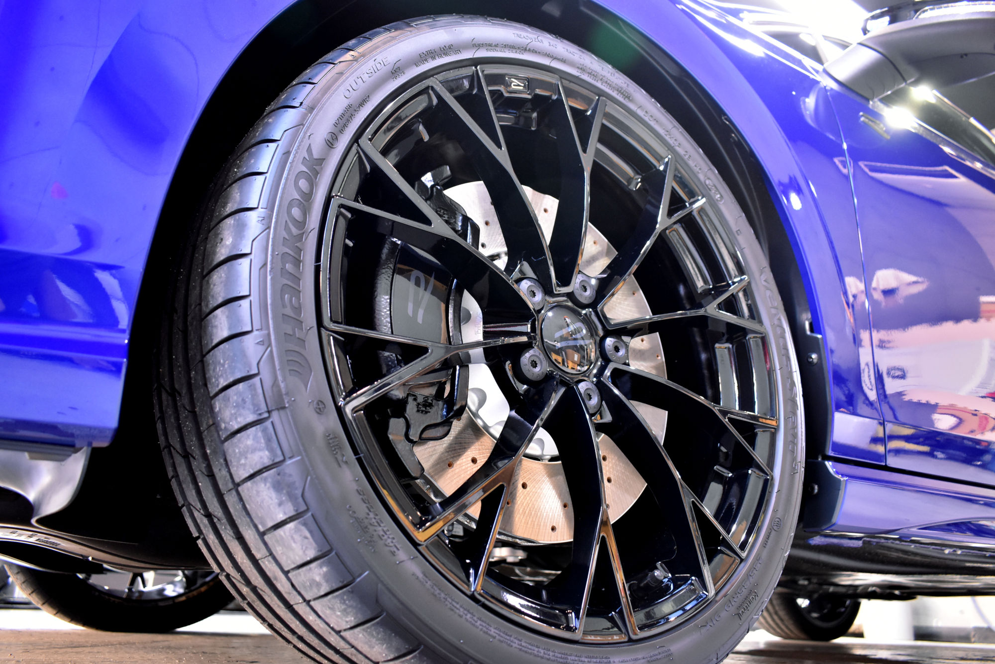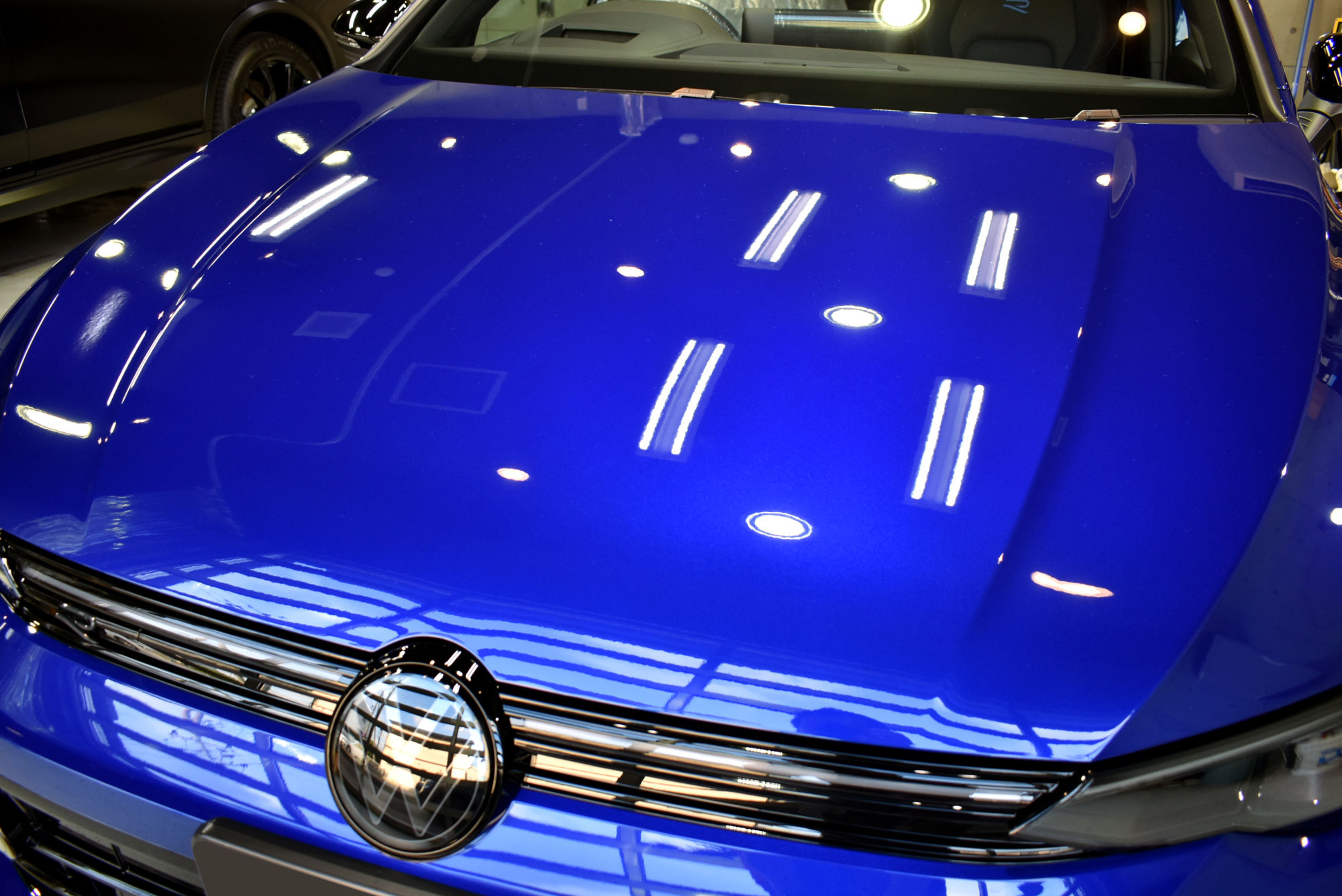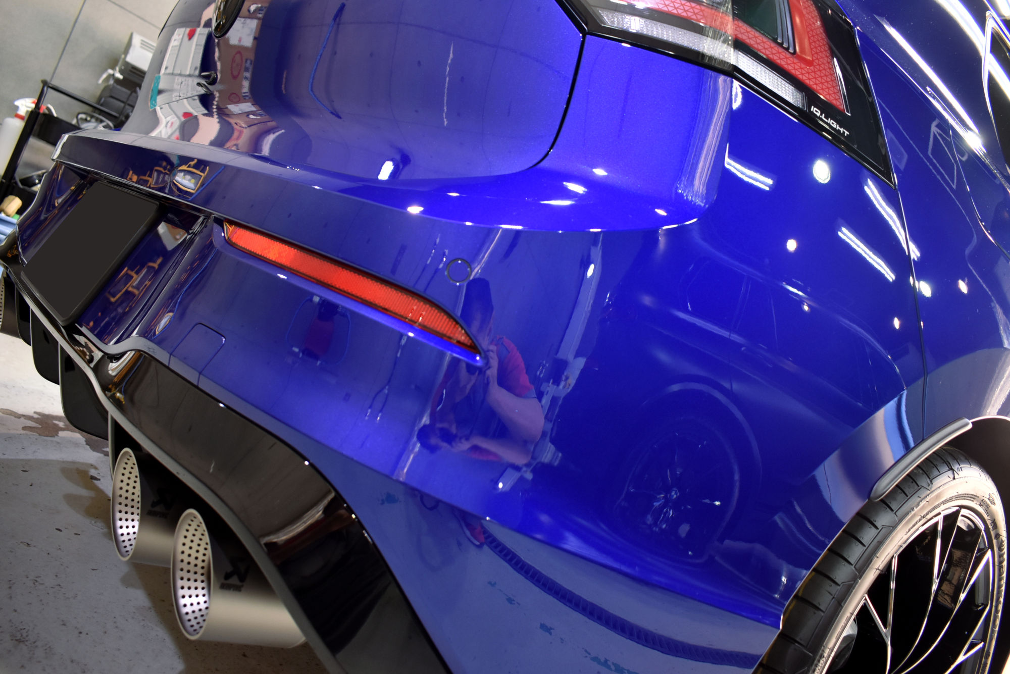 施工につきましては新車でのご入庫で、塗装面の状態も良好でしたので、極々軽い研磨作業で下地処理を終えることができました。そして下地処理を終えたボディには、セラミックコーティング剤のエクストリームのベースコート剤を手塗していきます。粘性のあるコート剤をたっぷりと塗布し、作業所に設置している高輝度LED照明や専用作業灯を駆使して余剰分をしっかりとふき取る作業をボディパネルごとに行います。その後定着・硬化時間を取り、トップコート・オーバートップコートを塗布して最強のセラミックコーティング完成です。なお、こちらのトップコート2種類はドアヒンジやボンネット・バックドアの内側にも塗布しておりますので、汚れの付着を低減しオーナー様のメンテ性を高められるようにいたしました。こちらはボディコーティングの他にWarmenau(ヴァルメナウ)鍛造ホイールにもセラミックコーティングをたっぷりと手塗しておりますので、洗車時のブレーキダスト除去にも一助となります。