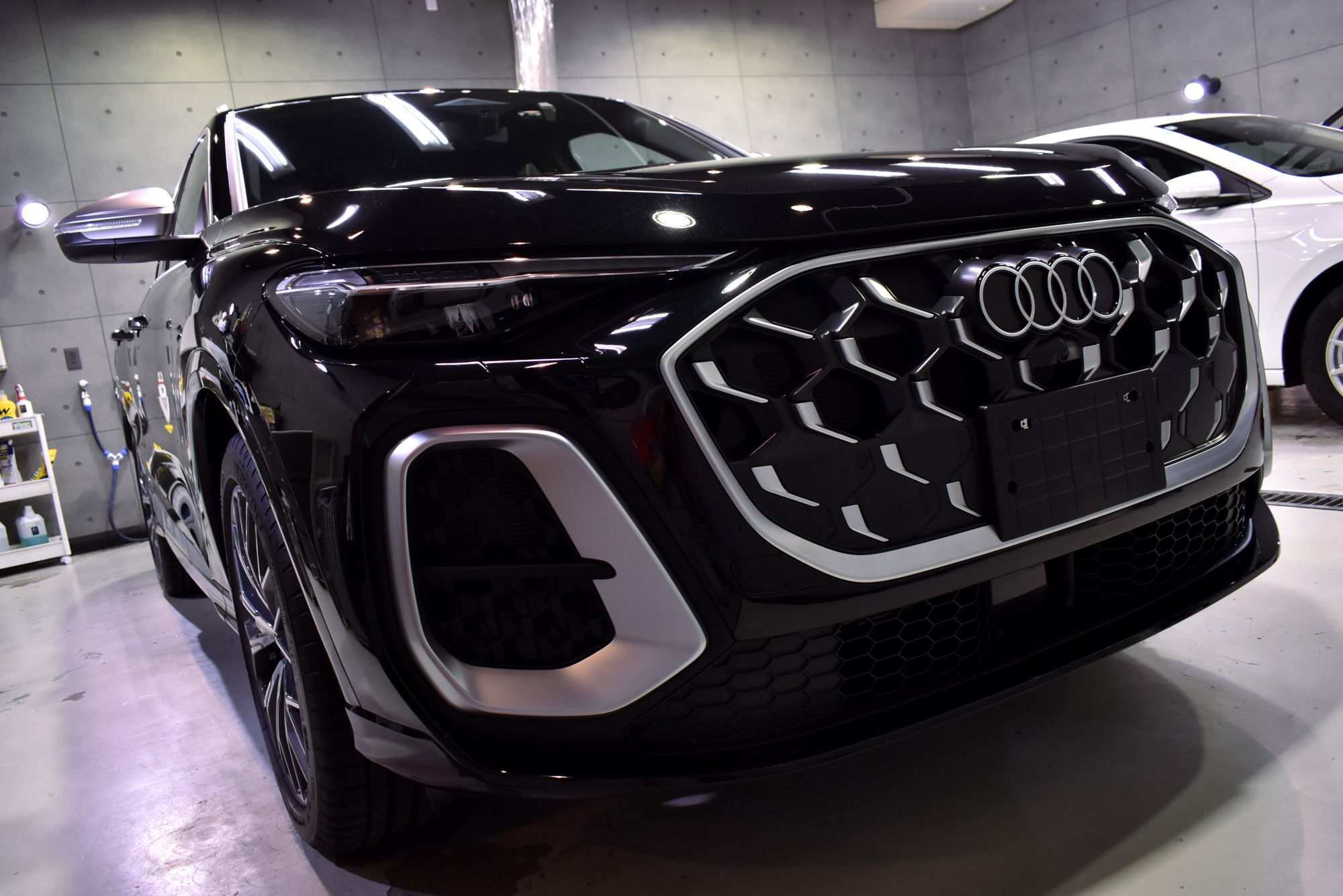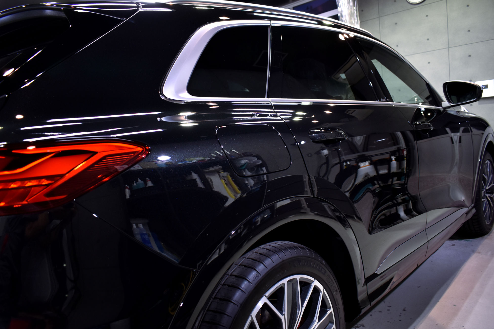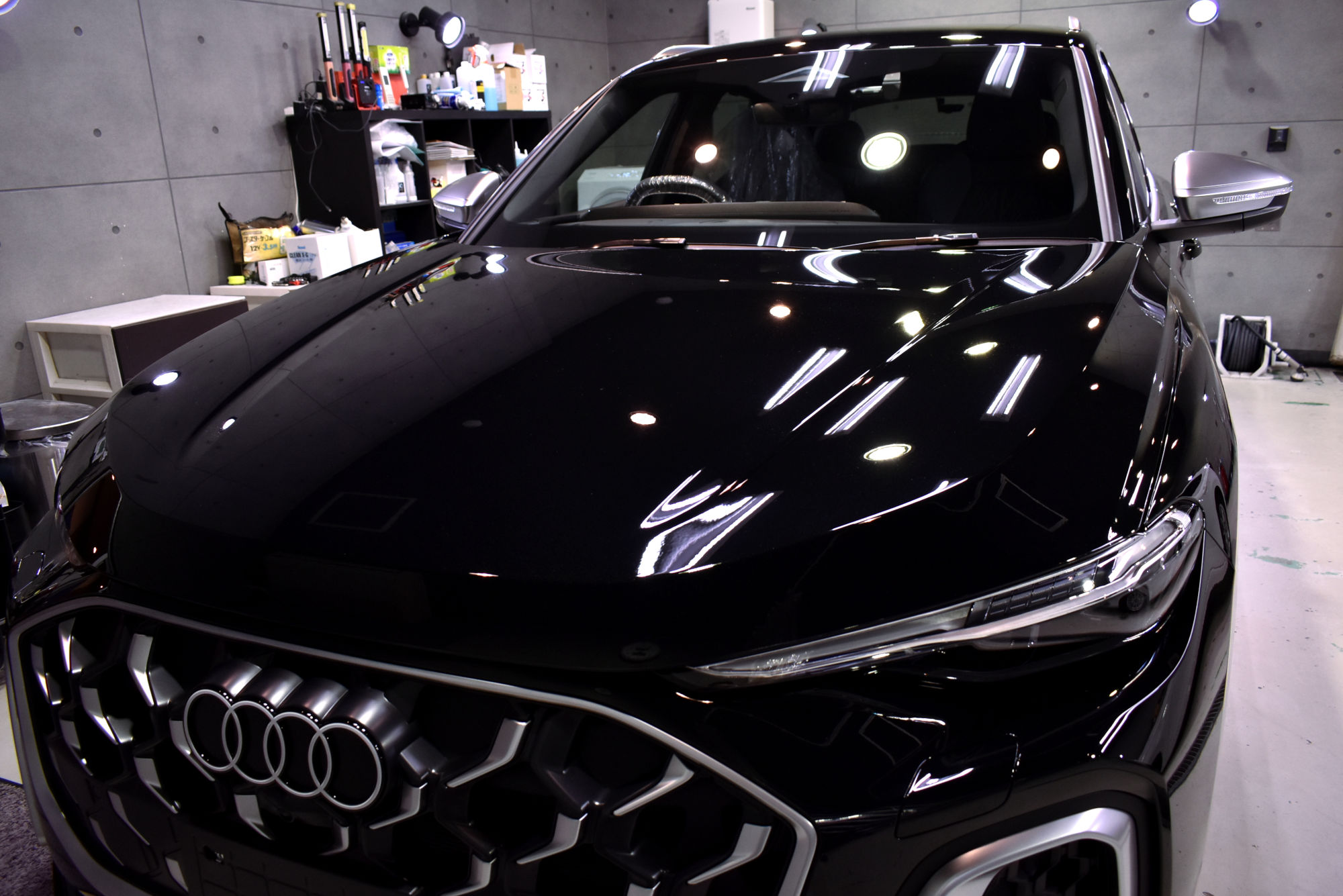 施工につきましては新車でのご入庫で、塗装面の状態も良好でしたので、極々軽い研磨作業で下地処理を終えることができました。そして下地処理を終えたボディには、セラミックコーティング剤のエクストリームのベースコート剤を手塗していきます。粘性のあるコート剤をたっぷりと塗布し、作業所に設置している高輝度LED照明や専用作業灯を駆使して余剰分をしっかりとふき取る作業をボディパネルごとに行います。その後定着・硬化時間を取り、トップコート・オーバートップコートを塗布して最強のセラミックコーティング完成です。なお、こちらのトップコート2種類はドアヒンジやボンネット・バックドアの内側にも塗布しておりますので、汚れの付着を低減しオーナー様による普段の洗車を容易にいたします。