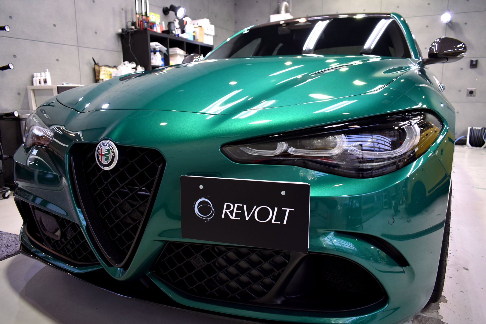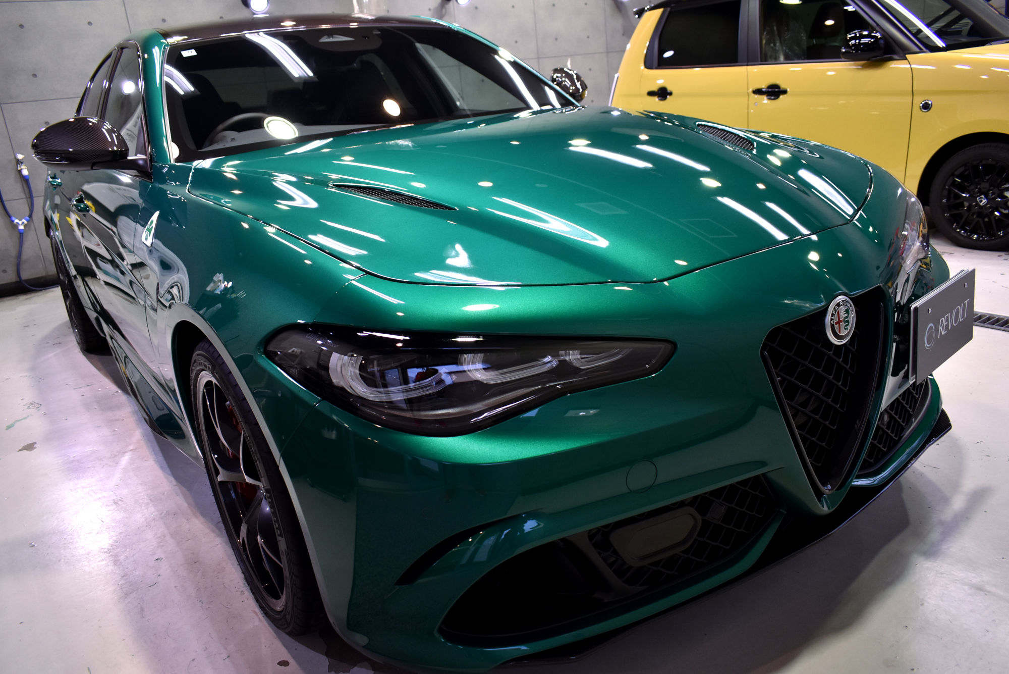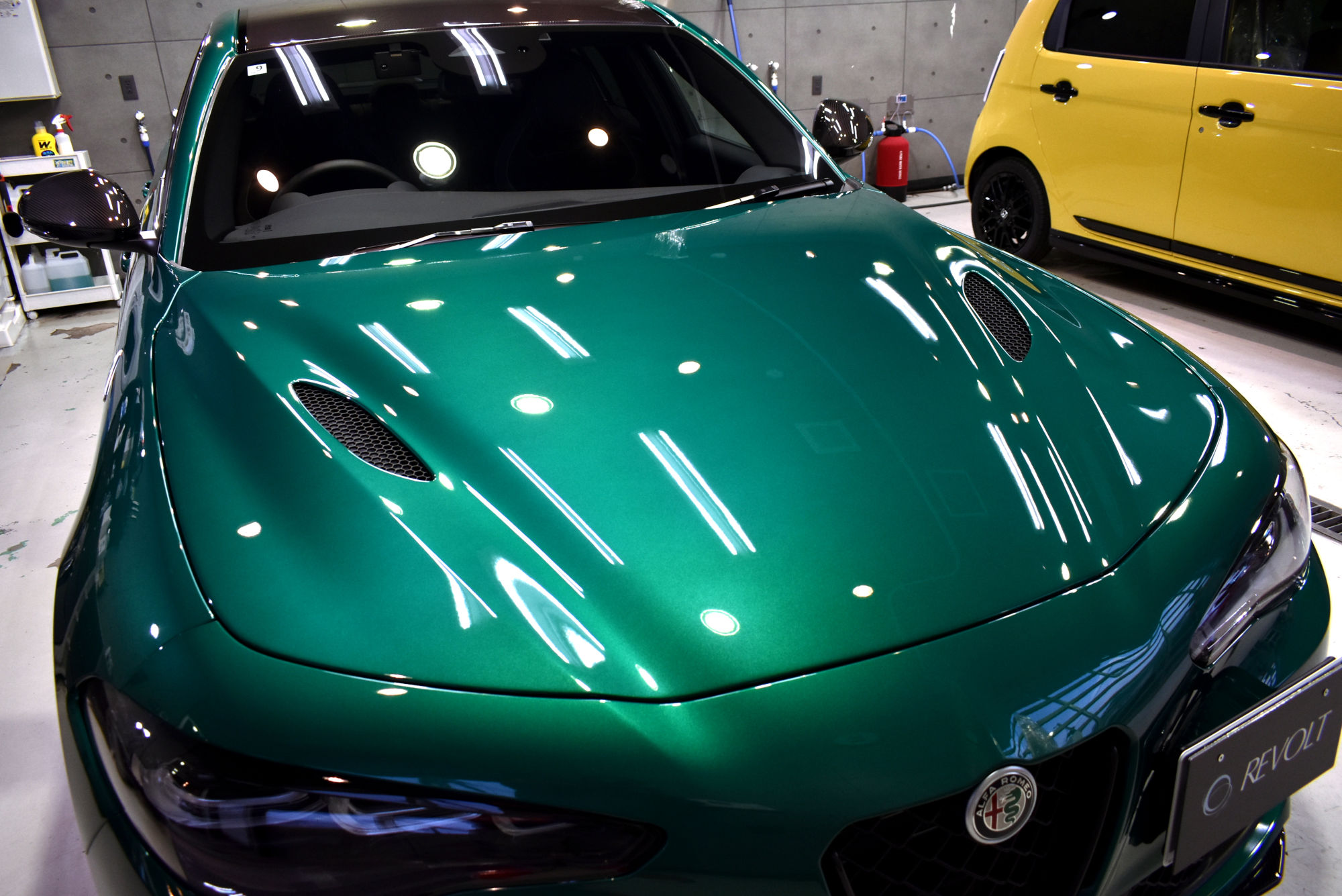 施工につきましては新車でご入庫いただき、細部洗浄から行い、50年以上前にデビューした「アルファ ロメオ モントリオール」へのオマージュという鮮やかな「モントリオールグリーン」の塗装を「Revolt Adjust System(リボルト アジャスト システム)」という独自の下地処理工法にて新車以上の塗装肌にしてから、高硬度、高膜厚を実現するセラミック成分配合のベースコートを惜しみなく手塗、その後トップコート・オーバートップコートで強固な3層コーティング被膜を造り上げました。