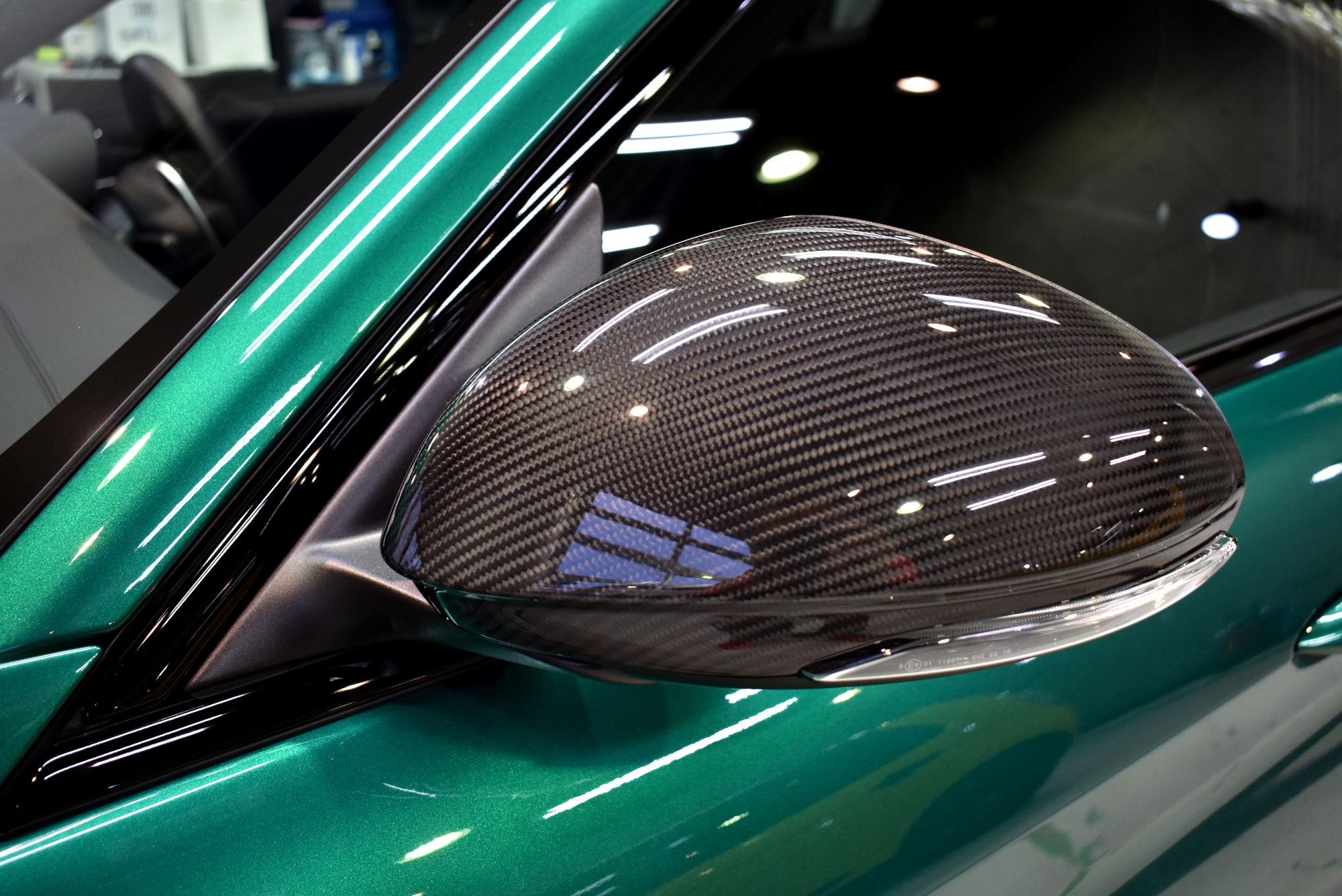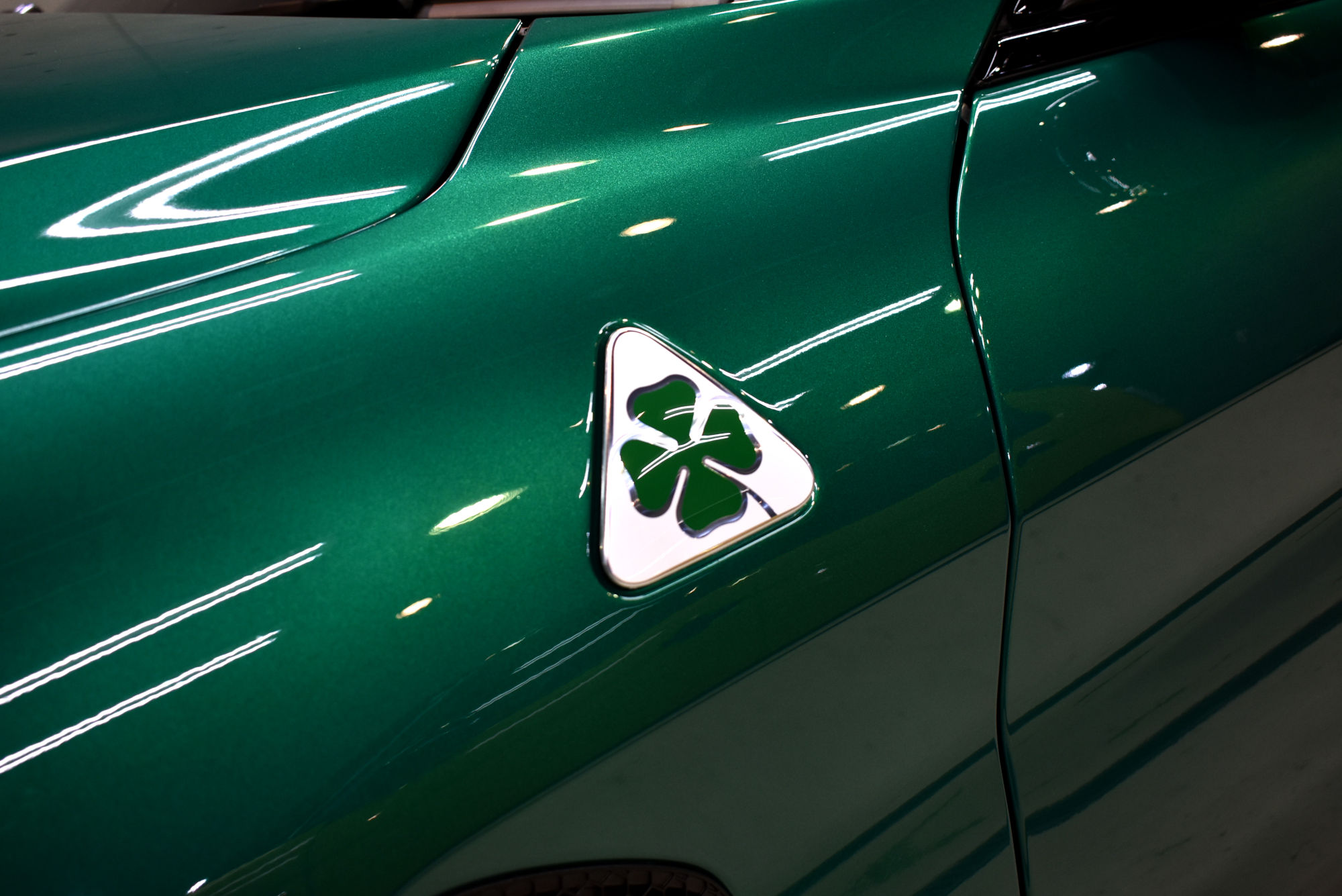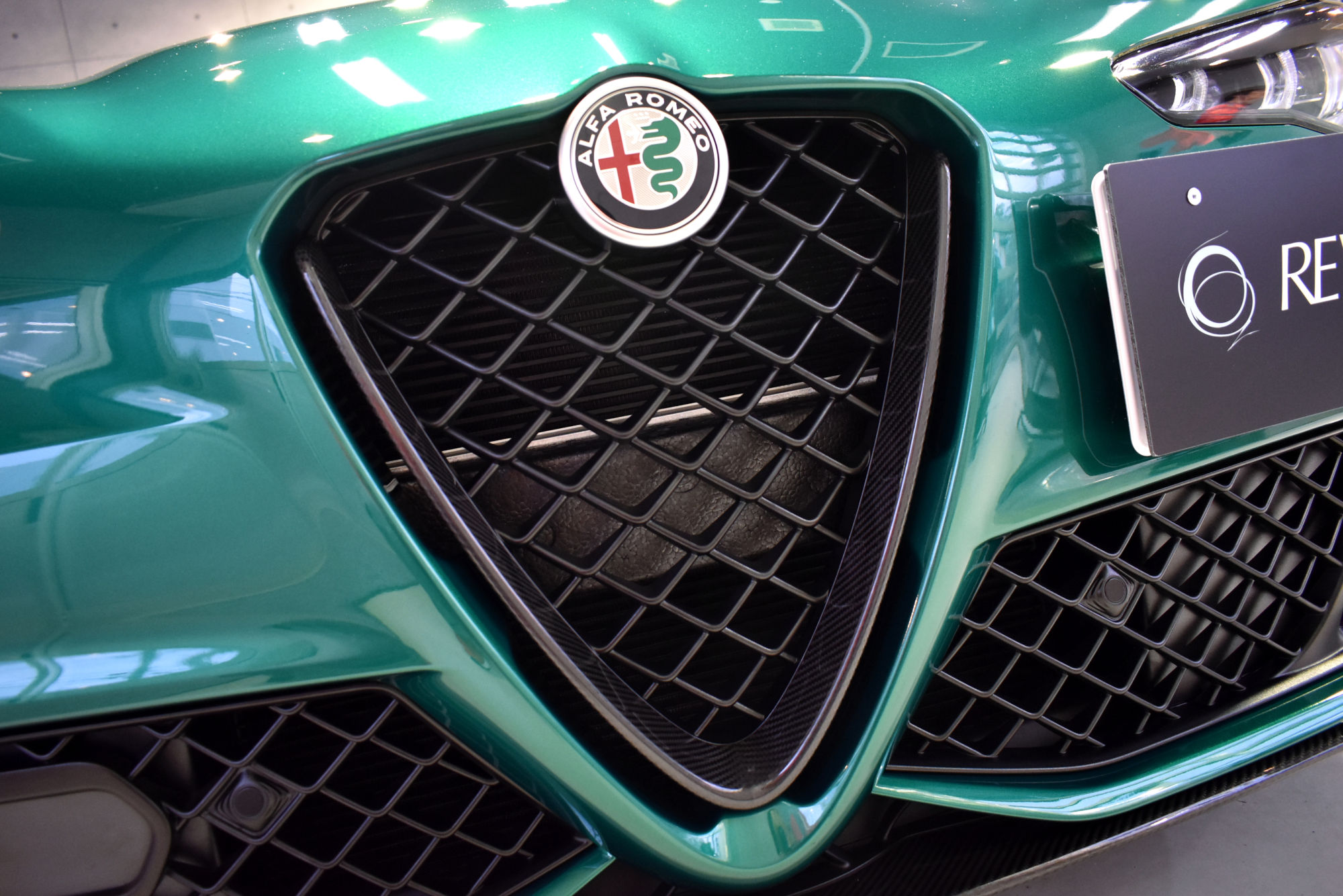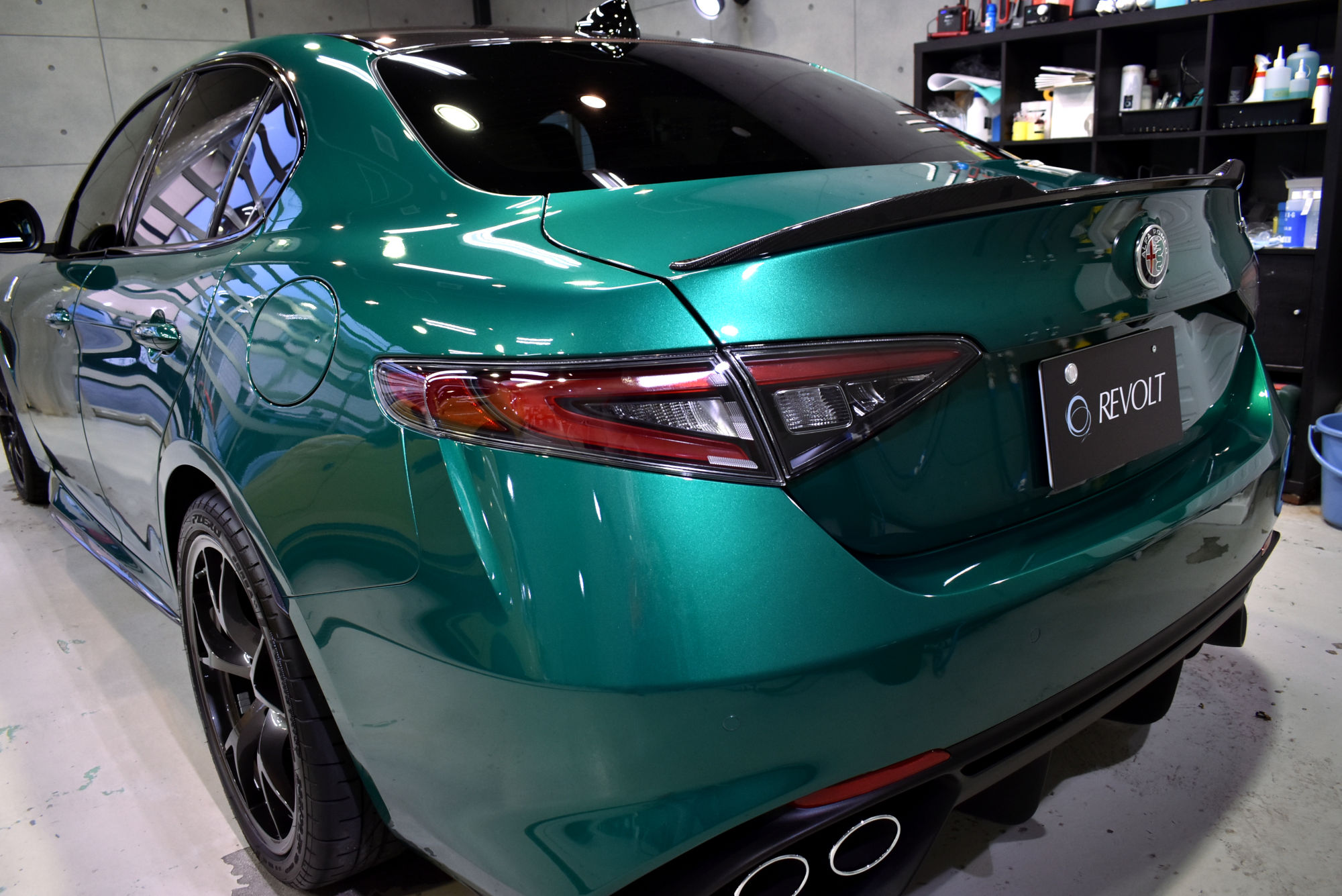 施工につきましては新車でご入庫いただき、細部洗浄から行い、50年以上前にデビューした「アルファ ロメオ モントリオール」へのオマージュという鮮やかな「モントリオールグリーン」の塗装を「Revolt Adjust System(リボルト アジャスト システム)」という独自の下地処理工法にて新車以上の塗装肌にしてから、高硬度、高膜厚を実現するセラミック成分配合のベースコートを惜しみなく手塗、その後トップコート・オーバートップコートで強固な3層コーティング被膜を造り上げました。