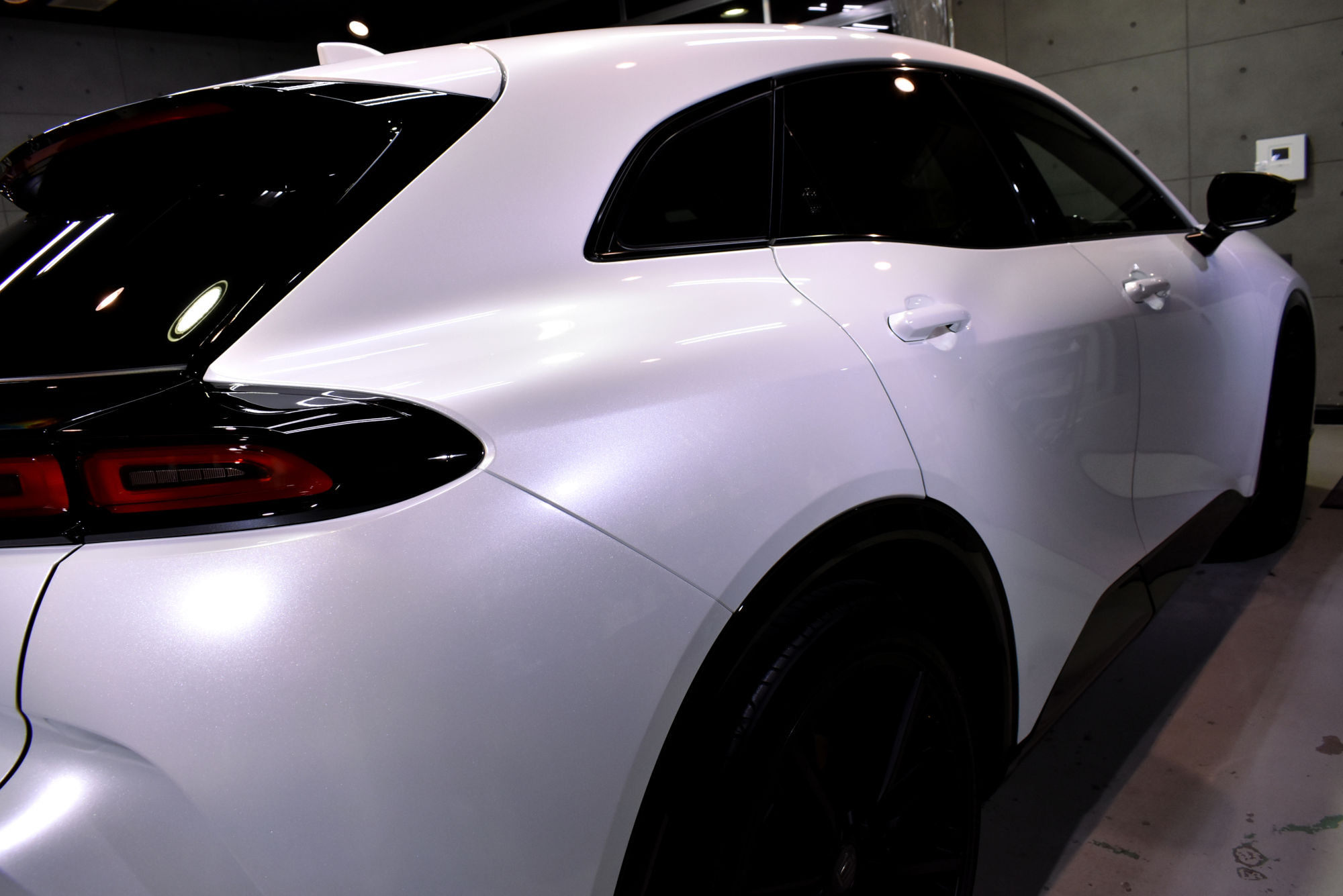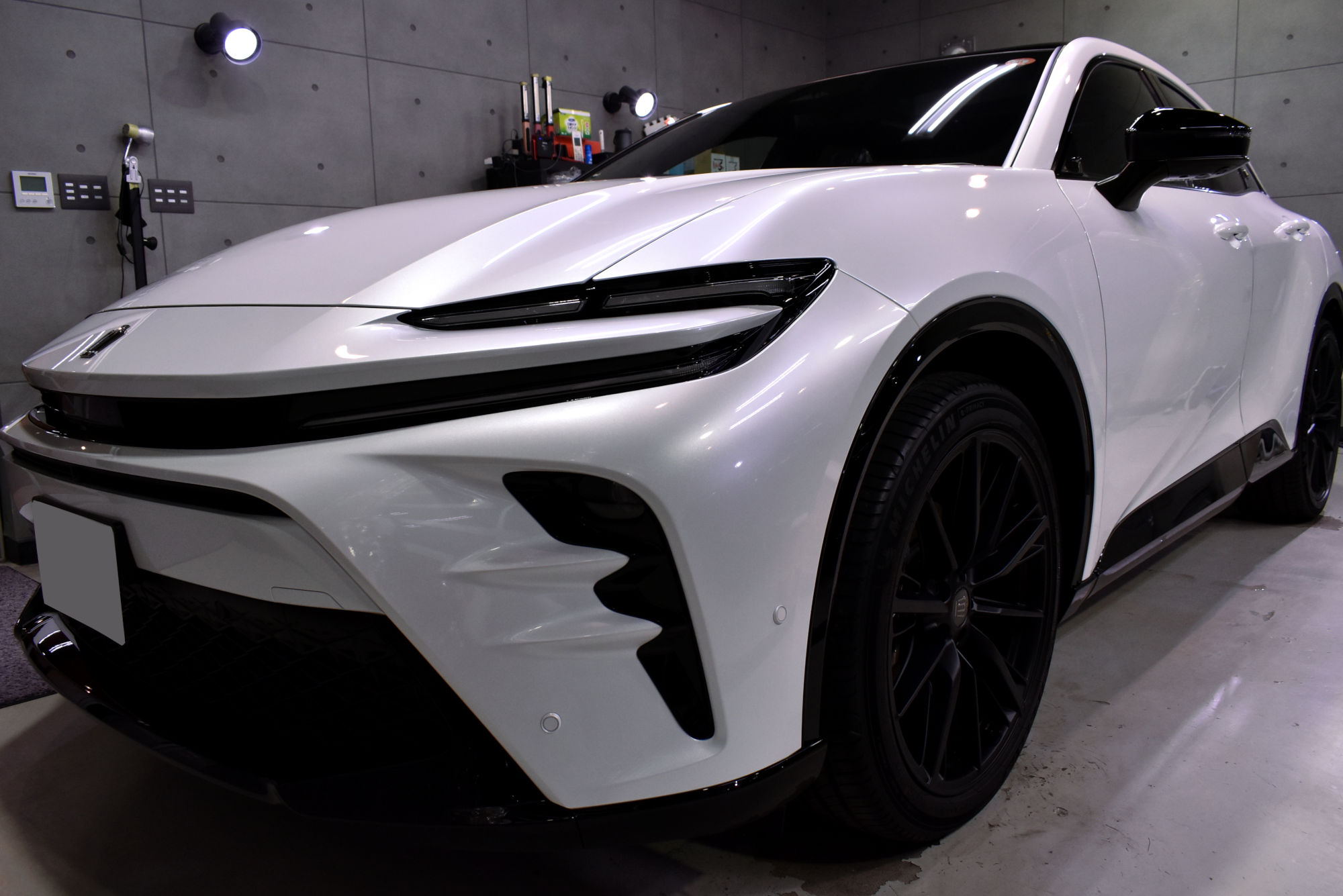 施工につきましてはご納車後すぐにご入庫いただいた新車のボディを細部洗浄から塗装研磨までの下地処理工程にて新車以上のコンディションを造り上げます。その後、綺麗に整いました塗装面には、次世代コーティングである完全硬化型セラミックコーティングをたっぷりと塗布します。ガラスコーティングとは違い粘性が高いベースコート剤が塗装面を厚く包み込むような膜厚感が得られます。そして最後にトップコートとエクストリームですので、オーバートップコートをコーティングして複層式コーティングを完成させました。こちらのトップコートは抜群の防汚性能により汚れが付着しにくく、付着してしまっても簡単に洗い流すことが出来ます。また耐スリ性能も上がりますので、傷の入るリスクも低減させます。