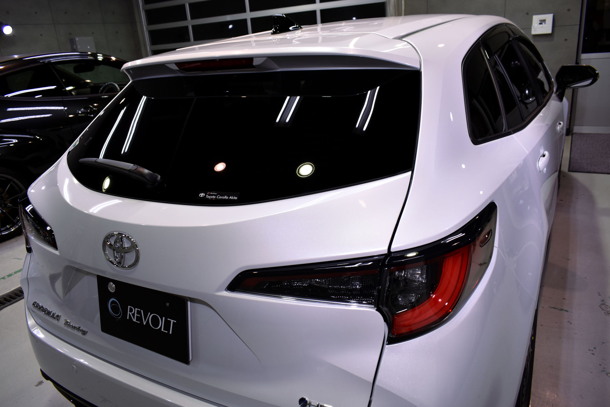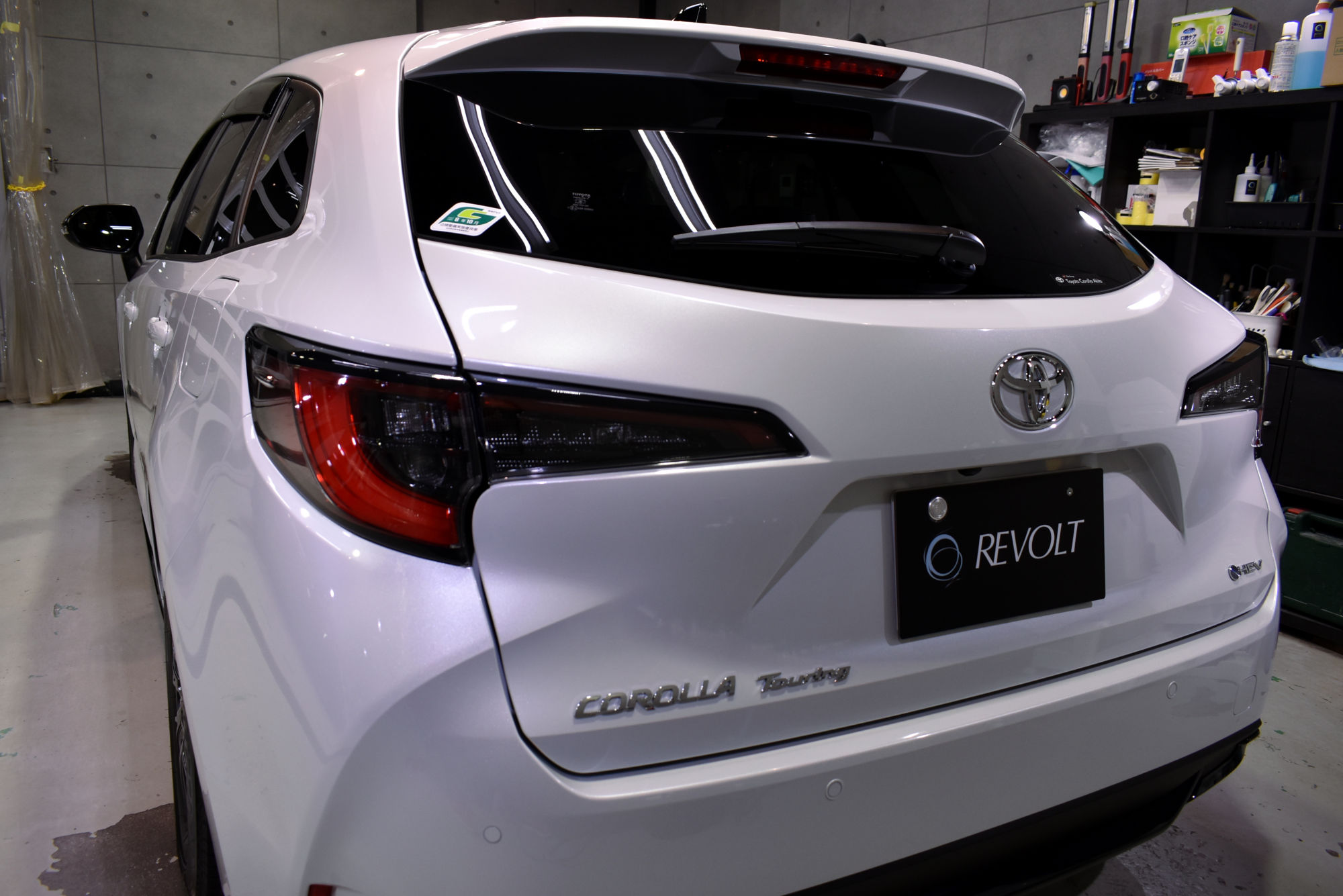 作業につきましては、新車でのご入庫ですが、工場ラインオフからオーナー様へのハンドオーバーまでに付着した小傷やシミ等の汚れを細部洗浄から塗装研磨までの下地処理にて新車以上のコンディションまで引き上げております。そして綺麗に整いましたボディには、ガラス濃度100%、無溶剤の完全硬化型ベースコーティング剤をたっぷりと塗布します。低分子コーティング剤なので緻密な塗装表面にしっかりと定着します。もちろんピアノブラックパーツや樹脂部分等に対しても、しっかりと隅々まで手塗りをするため、艶・輝きに加えて保護力、防汚力をアップさせます。そして最後にUV軽減効果を持つトップコート剤を、こちらもたっぷりと手塗して複層式コーティングを完成させました。