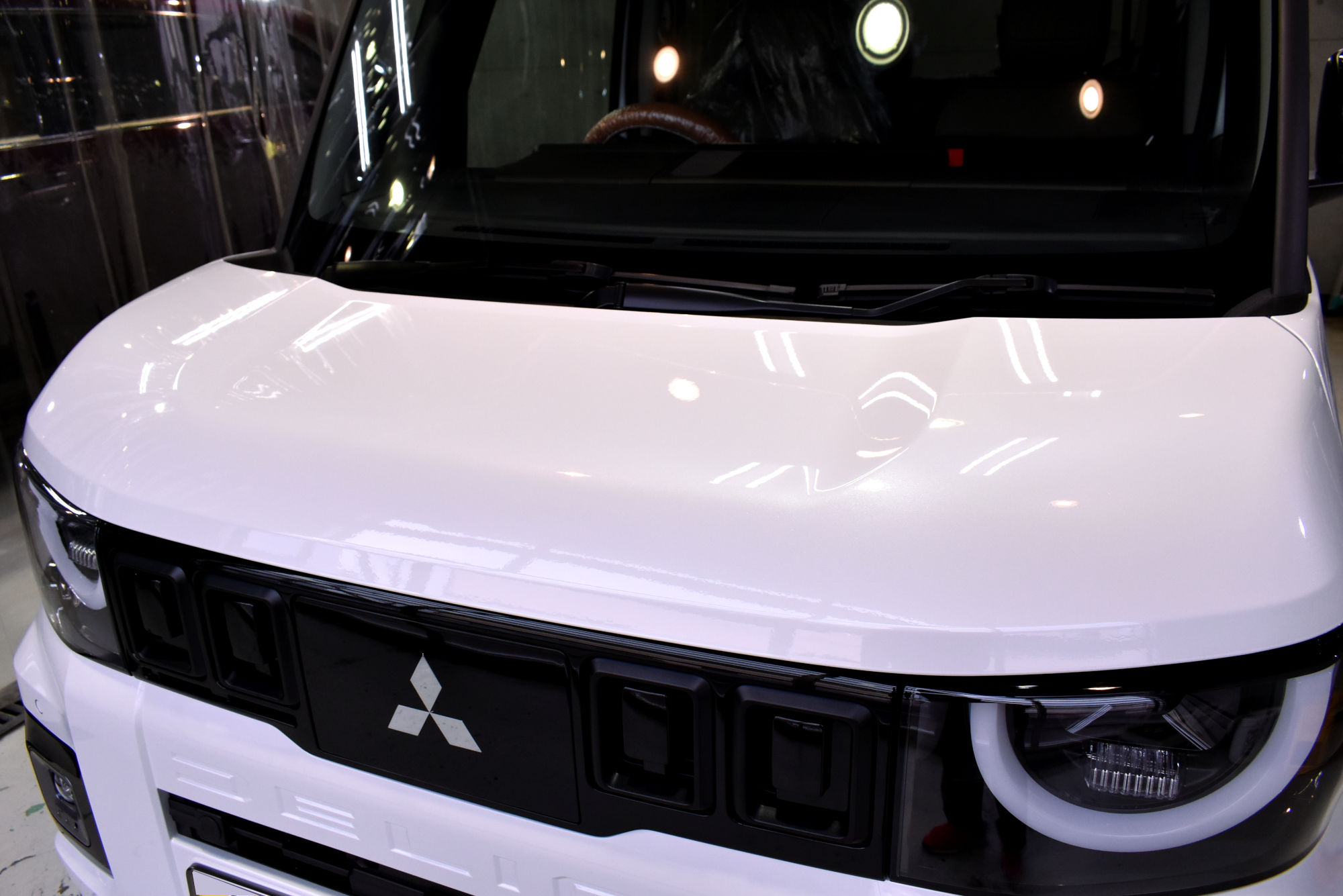 こちら新型デリカミニですが、2023年5月は「ekクロス スポーツ」のビックマイナーとして登場したモデルでしたので、今回は初のフルモデルチェンジとなります。エクステリアで目を引くのが独特の半円形ヘッドランプシグネチャーの大型化によって親しみやすさがアップ、前後のスキッドプレートを大型化しボンネットは厚みを強調した形状に変更、タフネスさが強調されて、さらに魅力度がグレードアップしました。