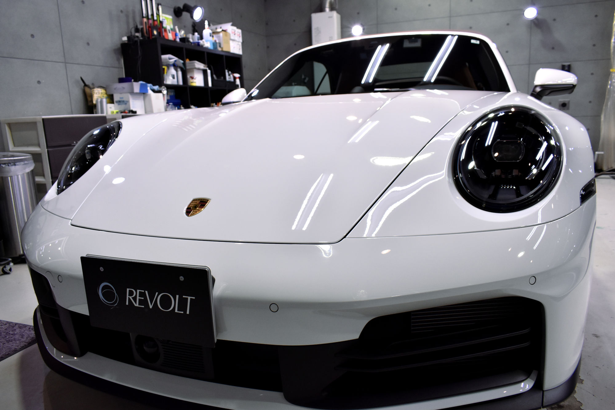 使用するベースコーティング剤であります「リボルト」は、「リボルト・プロ」と比較しますと、コーティングの効果期間や艶、輝き等は「リボルト・プロ」程ではありませんが、既存の量販ガラスコーティングよりは数段上の効果が期待できます。またトップコートにはリボルト・プロでも使用され、紫外線(UVA・UVB)によるダメージも軽減させる効果をもたらします。そしてコーティング施工後は、無機質なガラス被膜特有の膜厚感と深みが増した艶が加わります。