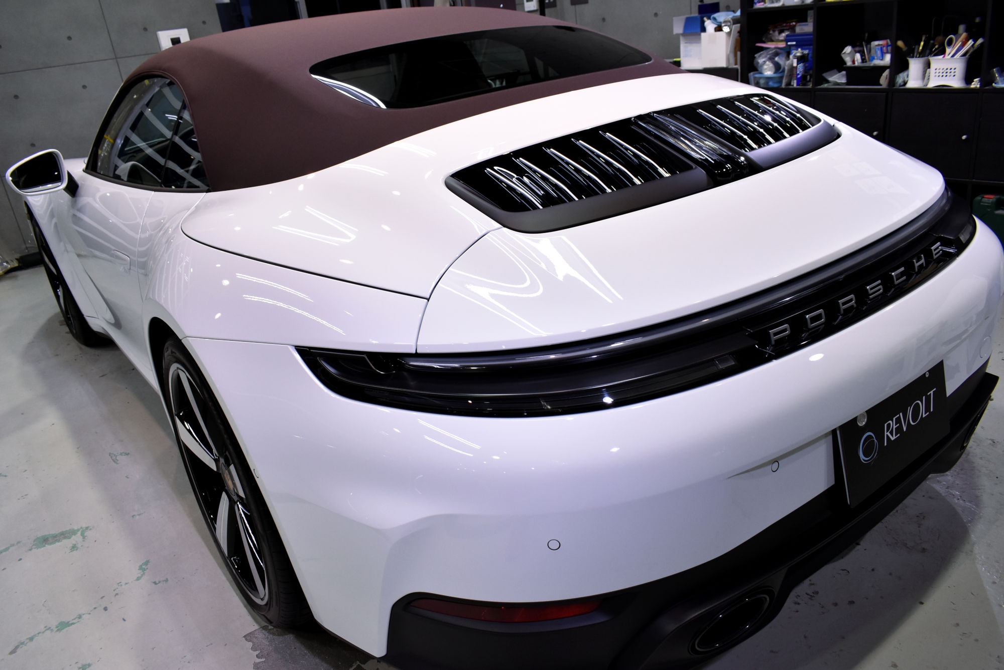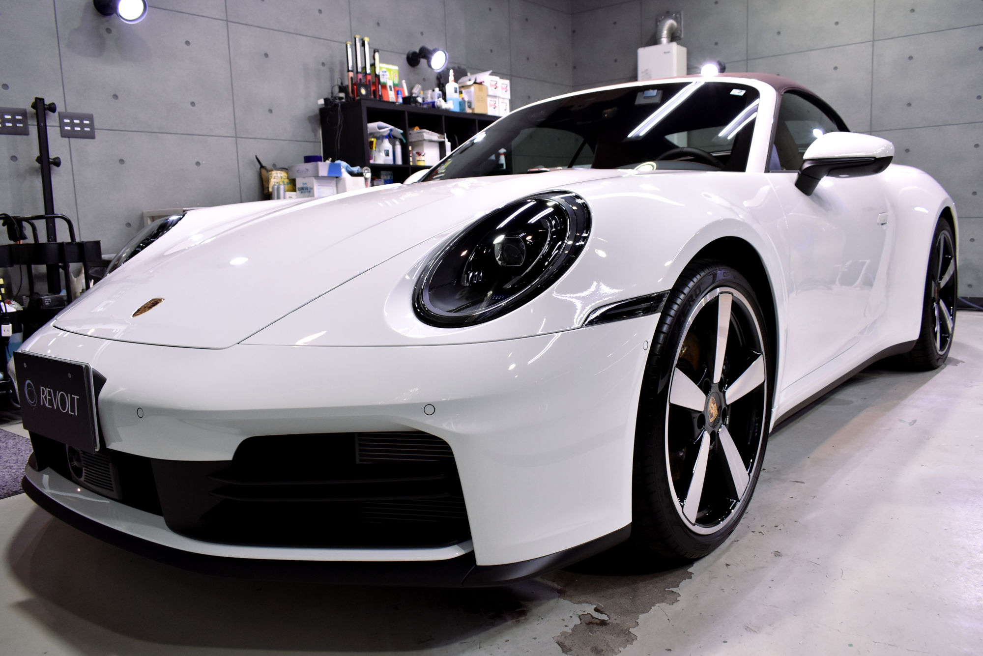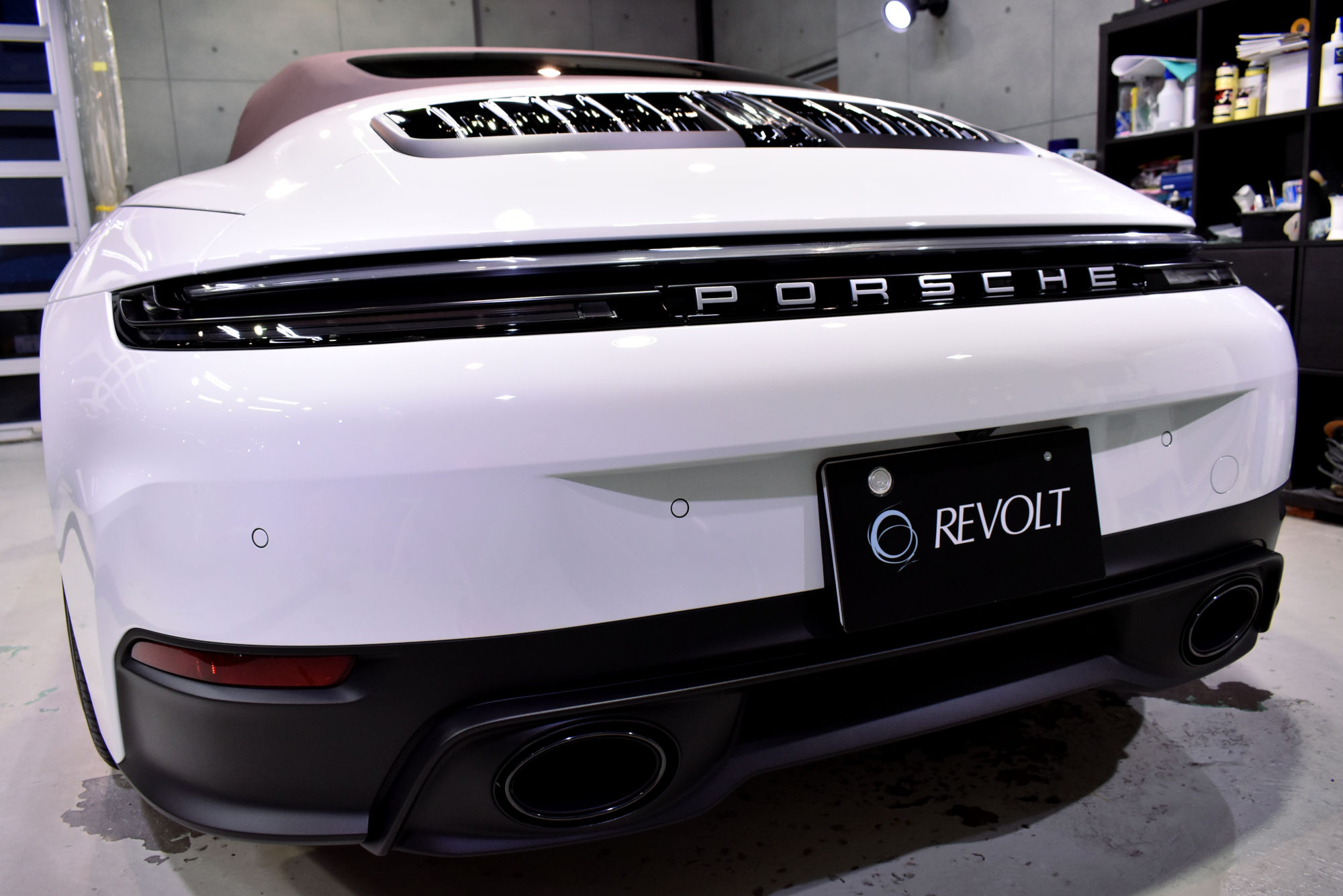 施工につきましては、初年度登録から少しお時間が経過しておりましたので、その間に付着した汚れや洗車傷などを、細部洗浄や塗装研磨にてしっかりと除去し、新車以上のコンディションへ導きます。「リボルト」のコーティングコースは、上位コーティング「リボルト・プロ」と同じく高度下地処理技術である「Revolt Adjust System」を適用して最良の状態まで施工いたします。