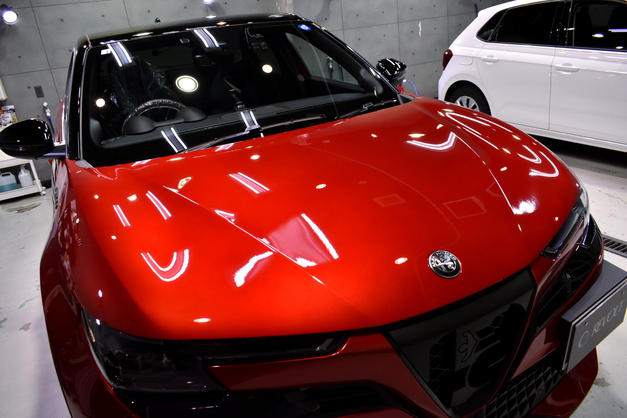 施工につきましては新車でご納車されてすぐにご入庫いただきましたが、細部洗浄から始め、新車でも付着しているシミや小傷、塗装のモヤリなどを「Revolt Adjust System(リボルト アジャスト システム)」という独自の研磨手法により優しく除去します。