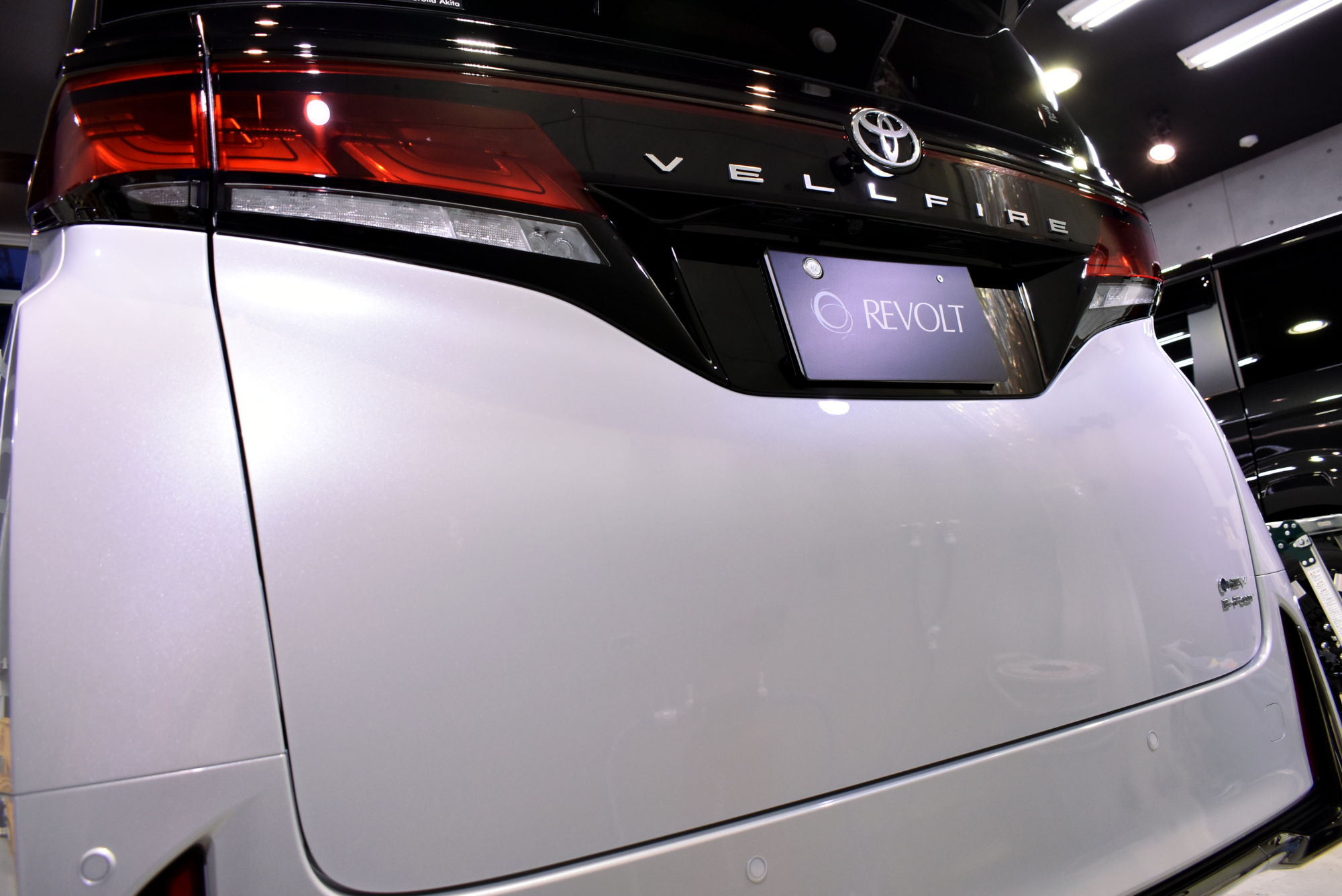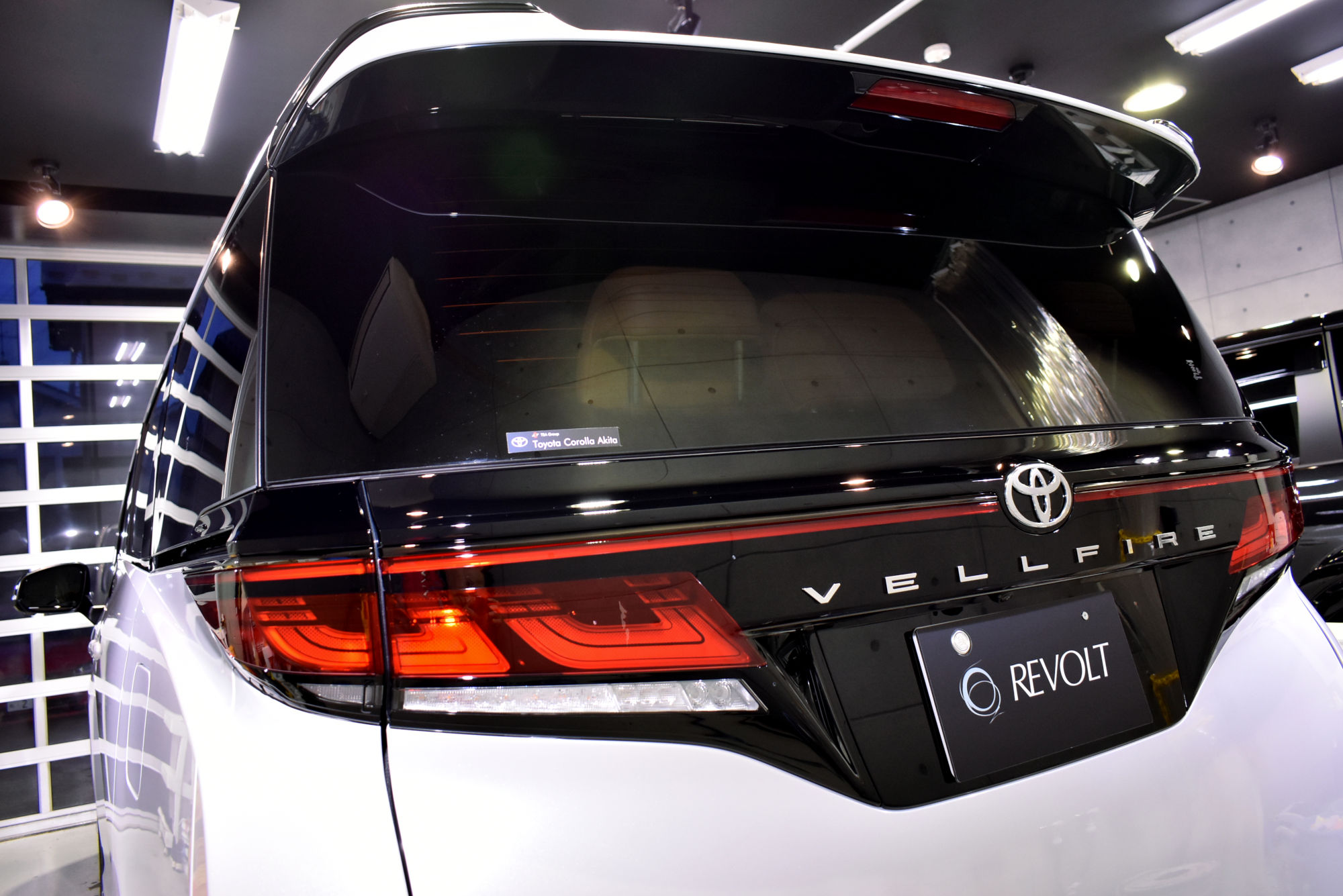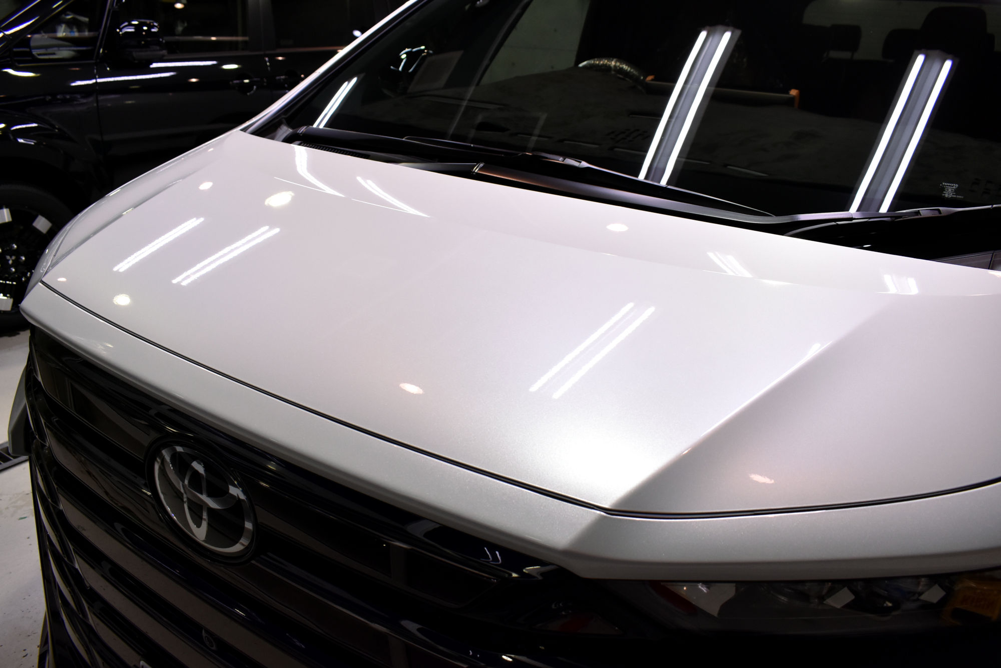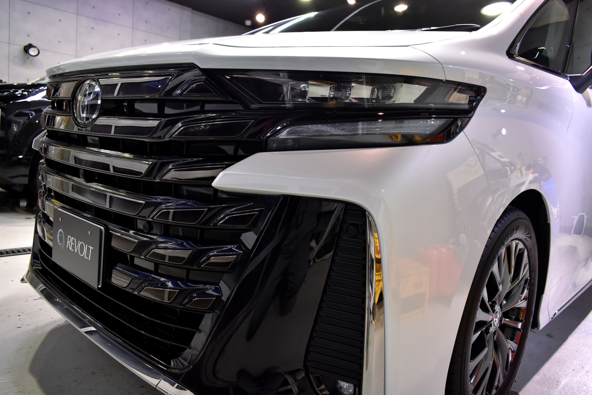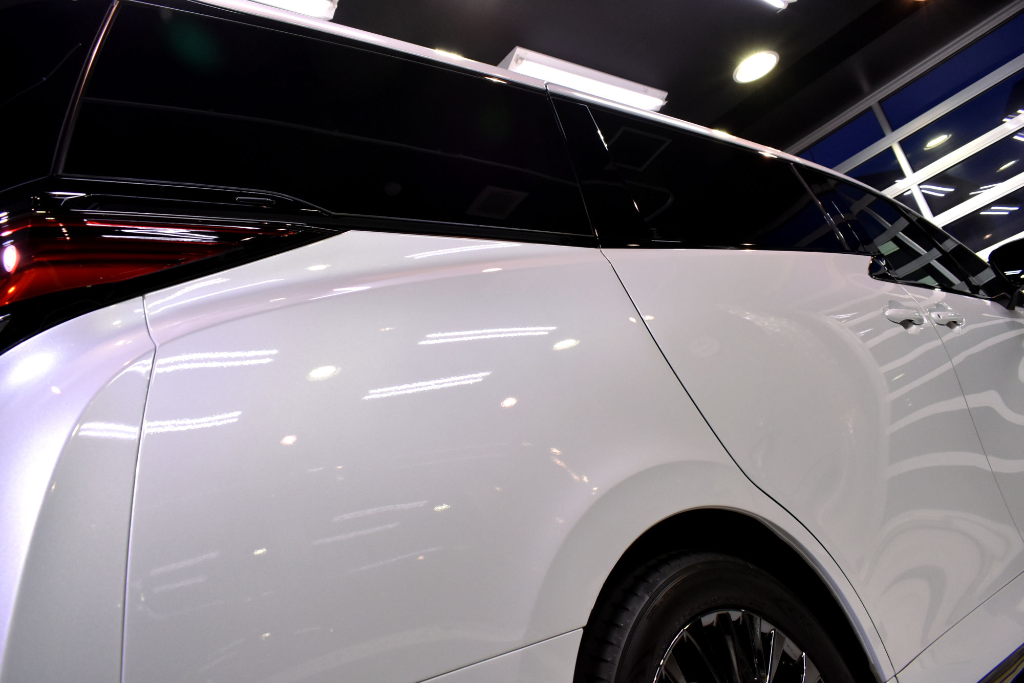 施工につきましては新車での入庫でしたので、綺麗な状態ではありますが、それでもオーナー様へお車が届くまでに付着した汚れや水ジミ、小傷を除去すべく徹底した下地処理から作業を始めます。細部洗浄から塗装の磨き(研磨)そしてコーティング前の洗車を終えますとこの段階で新車以上の輝きを放ちます。こうして下地処理を終えたボディに行う次の作業はコーティング剤の塗布です。分子量を小さくした低分子型・完全硬化型の最高級ガラスコーティング「リボルト・プロ」のベースコーティング剤をすべて手塗で施工いたします。また塗装面はもちろん、ライトレンズやテールランズ、樹脂・金属・メッキパーツ等窓ガラス以外の外装パーツに施します。そして究極の仕上げにはUVAとUVBの両紫外線を軽減する効果があるトップコートを外装はもちろん、ドアヒンジ、ボンネット等へも塗り込み完成です。