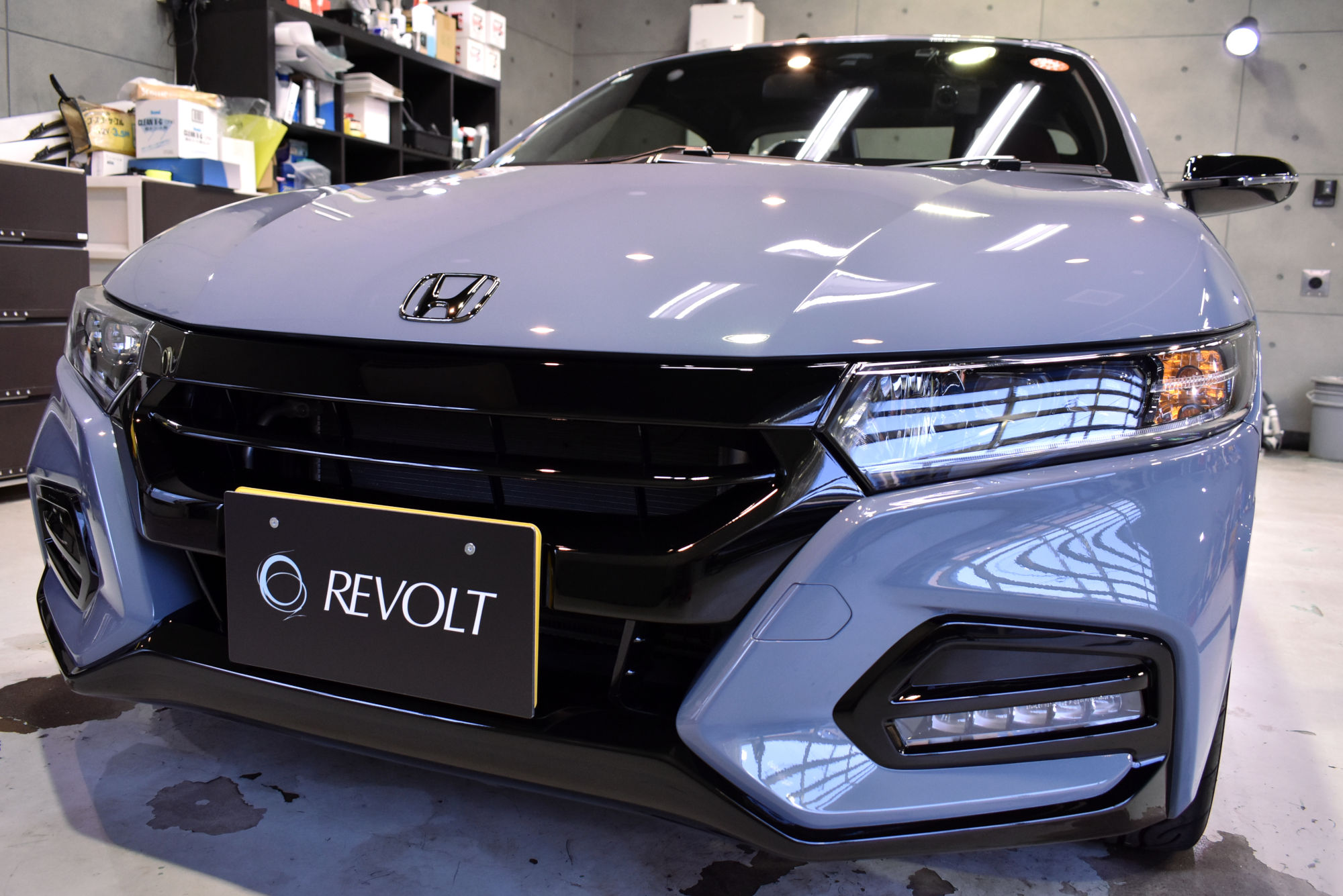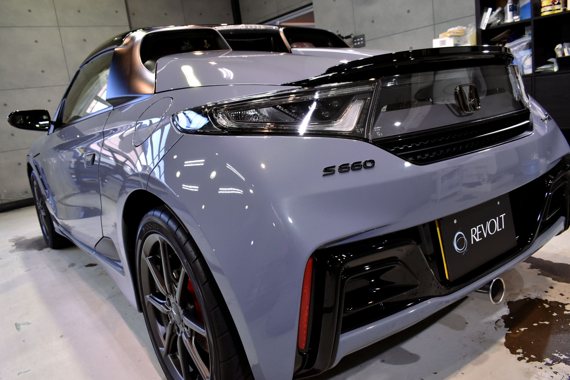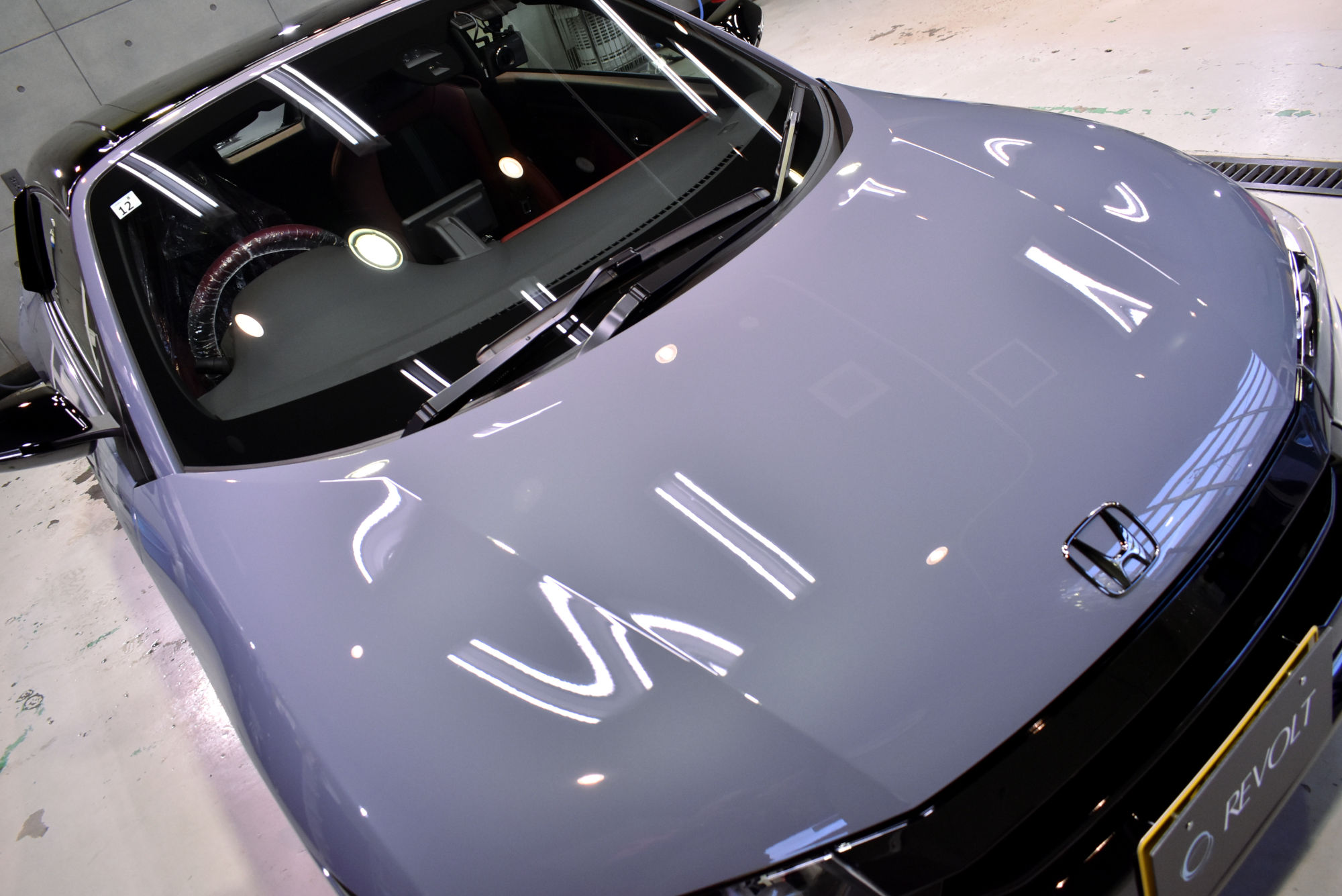 施工につきましては、初年度登録から少しお時間が経過したお車でしたので、その間に付着したシミや洗車傷等をリボルトグループが誇る「Revolt adjust system(リボルト アジャスト システム)」という独自の下地処理技術により、可能な限りリセットいたします。その後は、こうして整った塗装面をしっかり保護するべく、低分子、ガラス濃度100%の完全硬化型次世代ガラスコーティング剤「リボルト・プロ」でコーティングしていきます。こちらのベースコートは美しい塗装面を完全に保護し、更に潤いのある艶と高い輝きを与えます。そして仕上げは抜群の防汚性能と抜群の撥水性能と更にUVカット機能を持つトップコートを塗布し、ボディを二層式のコーティング膜でガッチリ保護いたしました。