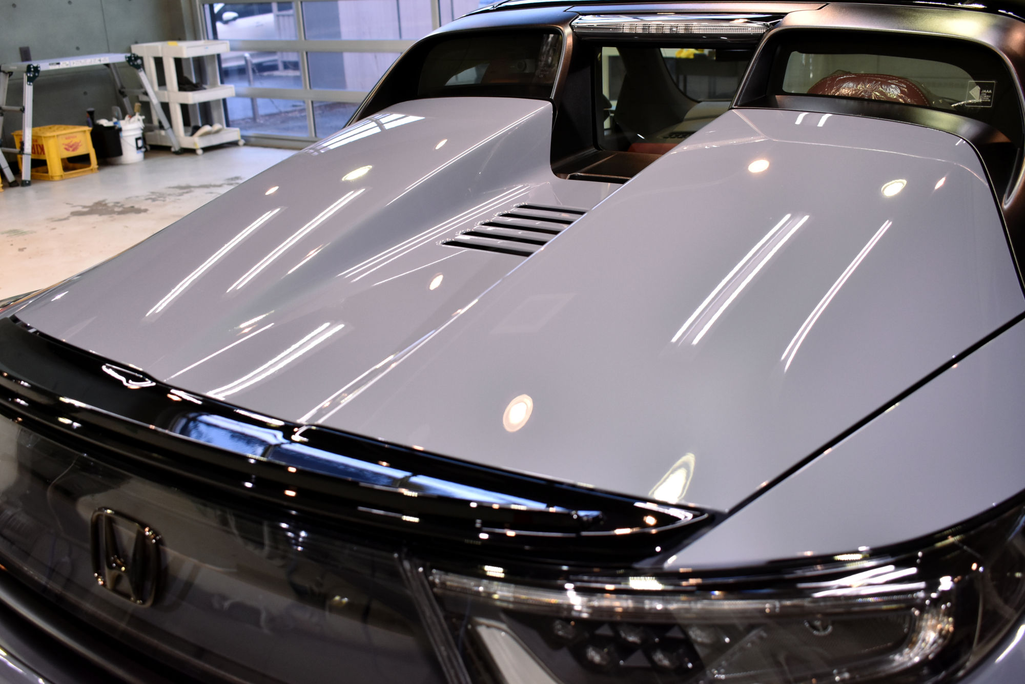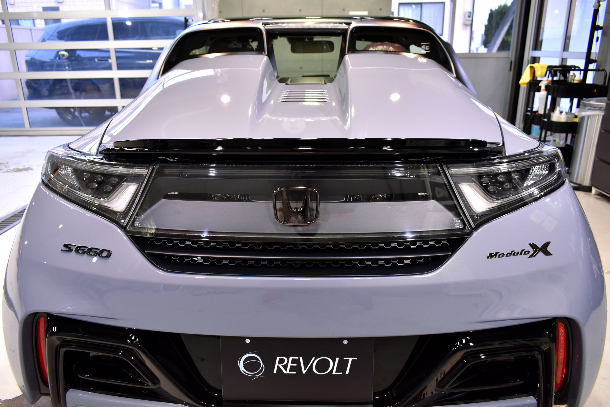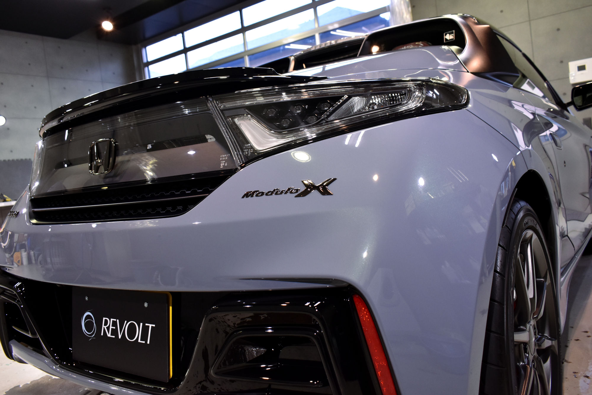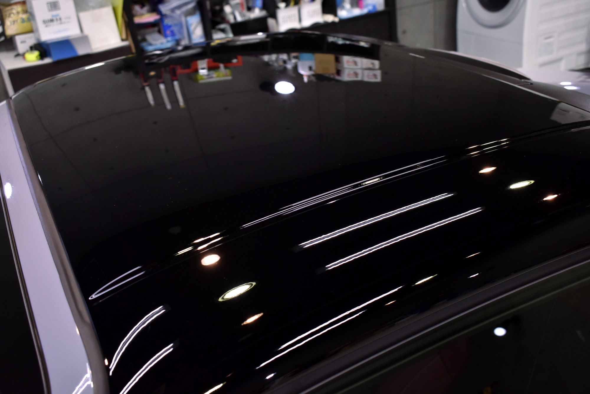 施工につきましては、初年度登録から少しお時間が経過したお車でしたので、その間に付着したシミや洗車傷等をリボルトグループが誇る「Revolt adjust system(リボルト アジャスト システム)」という独自の下地処理技術により、可能な限りリセットいたします。その後は、こうして整った塗装面をしっかり保護するべく、低分子、ガラス濃度100%の完全硬化型次世代ガラスコーティング剤「リボルト・プロ」でコーティングしていきます。こちらのベースコートは美しい塗装面を完全に保護し、更に潤いのある艶と高い輝きを与えます。そして仕上げは抜群の防汚性能と抜群の撥水性能と更にUVカット機能を持つトップコートを塗布し、ボディを二層式のコーティング膜でガッチリ保護いたしました。