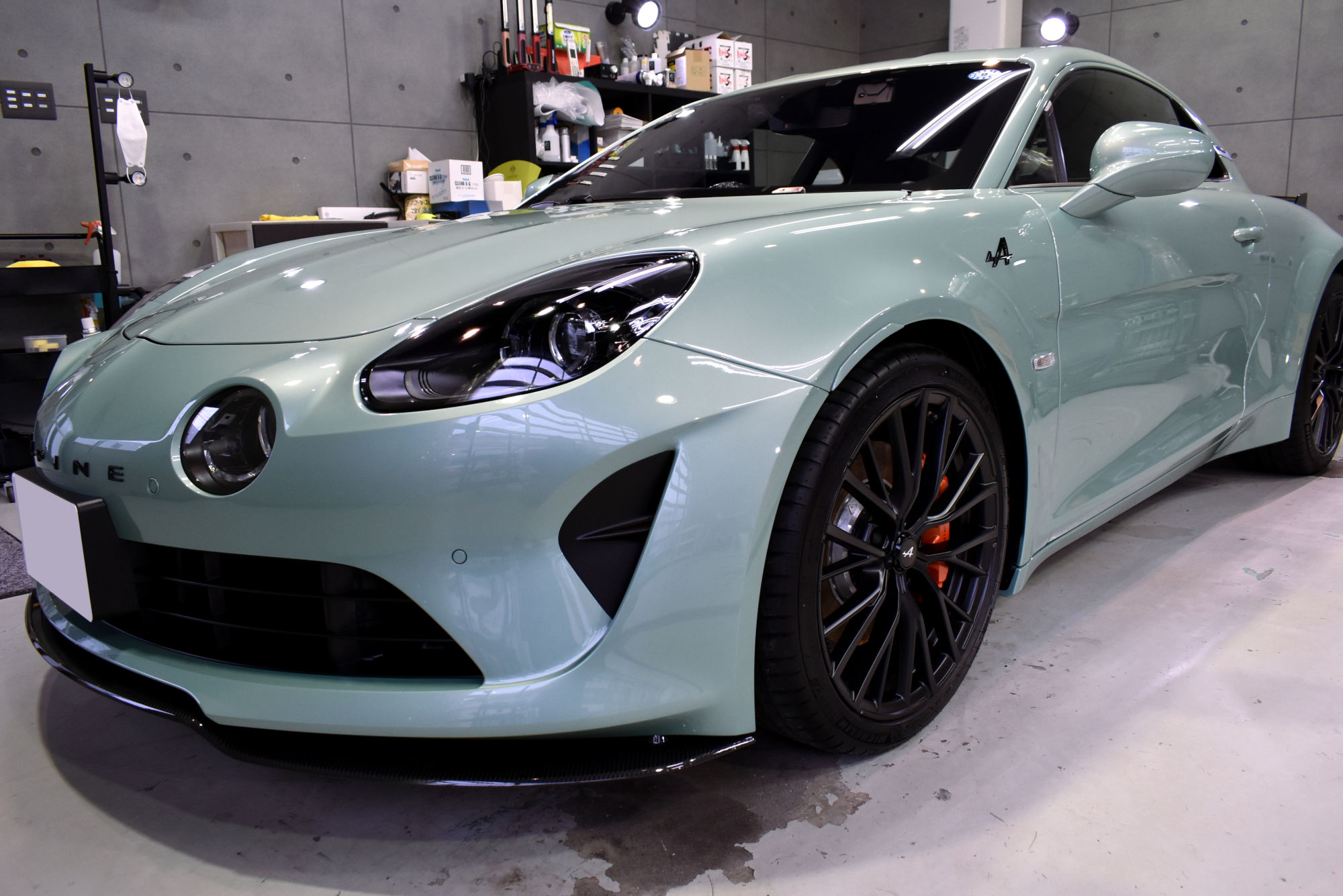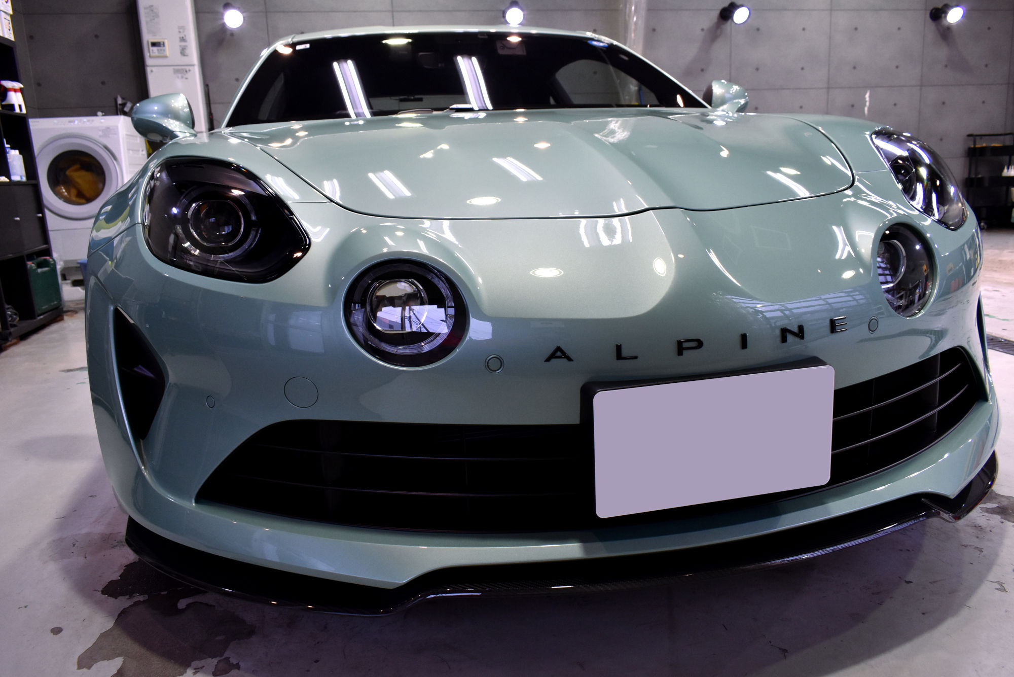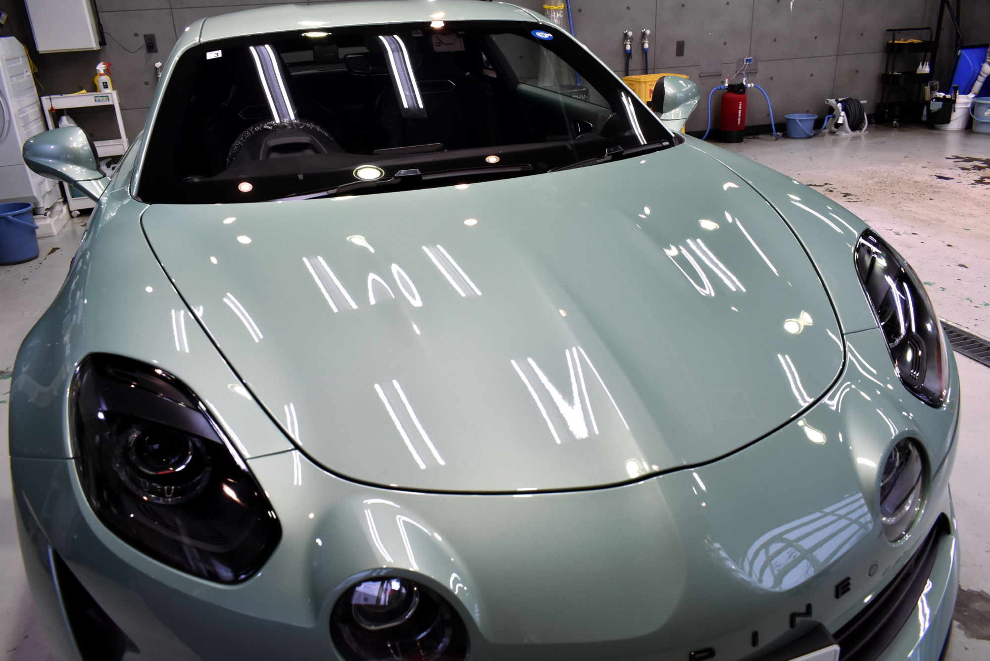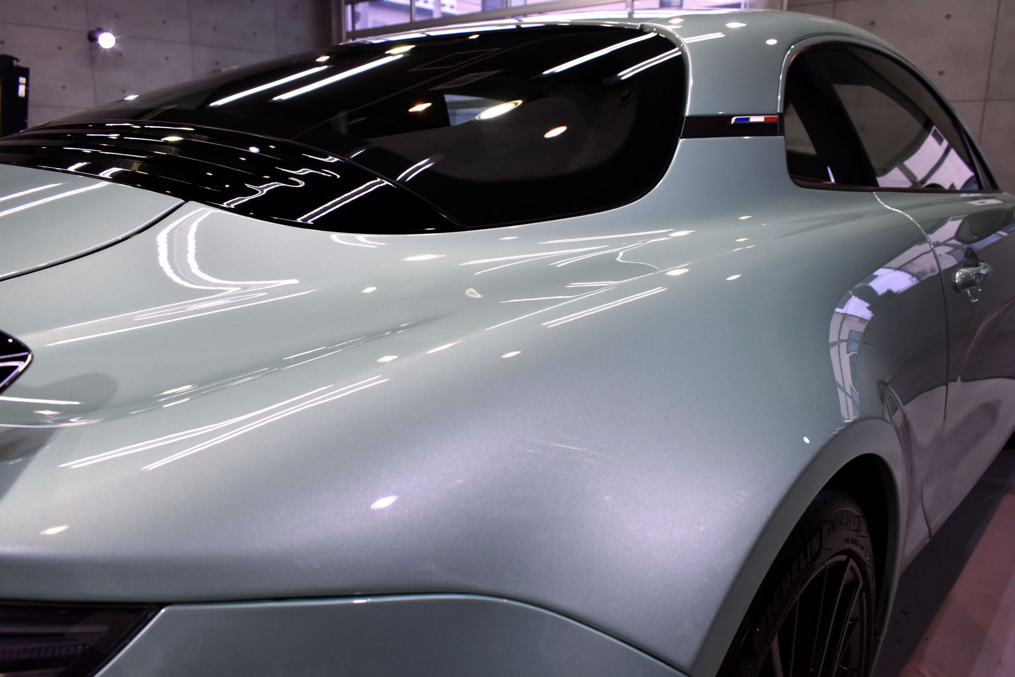 施工につきましては、新車でのご入庫でしたが、シミや小傷が見受けられましたので細部洗浄から始め、ヘリテージカラーの「ヴェールノルマンメタリック」のプレミアムな塗装を「Revolt Adjust System(リボルト アジャスト システム)」というリボルト独自のポリッシング技術で塗装に負荷をかけることなく優しく仕上げて参ります。その後、綺麗に整いました塗装面には、次世代コーティングである完全硬化型セラミックコーティングをたっぷり塗布します。低分子なので緻密な塗装表面にしっかりと入り込みその後完全硬化します。これで、艶、輝きに加えて保護力、防汚力をアップさせます。ベースコート塗布後は定着・硬化時間を取り、トップコート・オーバートップコートを塗布して最強のセラミックコーティング完成です。なお、こちらのトップコート2種類はドアヒンジやボンネット・バックドアの内側にも塗布しておりますので、汚れの付着を低減しオーナー様のメンテ性を高められるようにいたしました。
